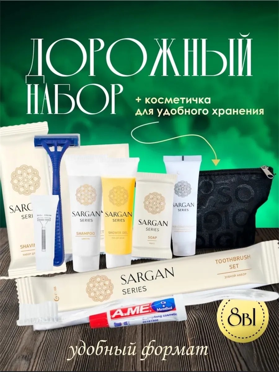 Комплектациягигиенический набор; гель для душа 30 мл; зубная щетка с пастой 6 гр; Шампунь 30 мл; Бальзам для волос; бритва и бальзам для бритья; мыло 13 гр; косметичка