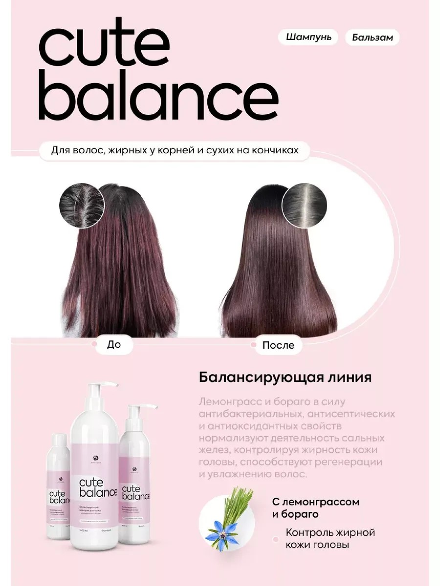 Cute Balance - a set of shampoo, conditioner and hair mask (1000 ml + 1000 ml + 500 ml). Adricoco Cute Balance Shampoo is the ideal solution for cleansing oily and problematic scalps, as well as weakened and aging locks. The product lathers beautifully, washes away all impurities, removes keratinized particles of the epithelium, gives a long-lasting feeling of freshness and lightness. The combination of lemongrass and borage allows you to: improve skin immunity; relieve inflammation; provide antimicrobial and antibacterial support; sanitize the skin from pathogenic microflora; normalize the sebaceous glands; reduce the amount of sebum; rejuvenate hair follicles; significantly strengthen and rejuvenate the hair shaft. Adricoco Cute Balance Balsam, a balm for sensitive scalps, features a high concentration of anti-inflammatory and immune-boosting extracts. Ideal for oily and demanding scalps, it quickly improves condition and nourishes weakened and dull hair. Adricoco Cute Balance Balsam contains lightweight conditioning ingredients that make hair easier to manage and provide additional protection against dehydration. Adricoco Cute Multi Mask is a mask for intensive and rapid restoration of even the most damaged and weakened hair. It is highly effective for reconstructing hair after harsh chemical treatments, as well as for overly dry and brittle locks. The mask contains an optimal combination of hyaluronic acid and collagen: Hyaluronic acid works in two directions: rejuvenating and moisturizing. It makes hair stronger, shinier, and smoother, completely eliminating dryness along the lengths and brittle ends, and maintaining a proper moisture balance. Collagen is woven into the cortex, thickening it from the inside, eliminating structural breaks, and strengthening disulfide bonds.