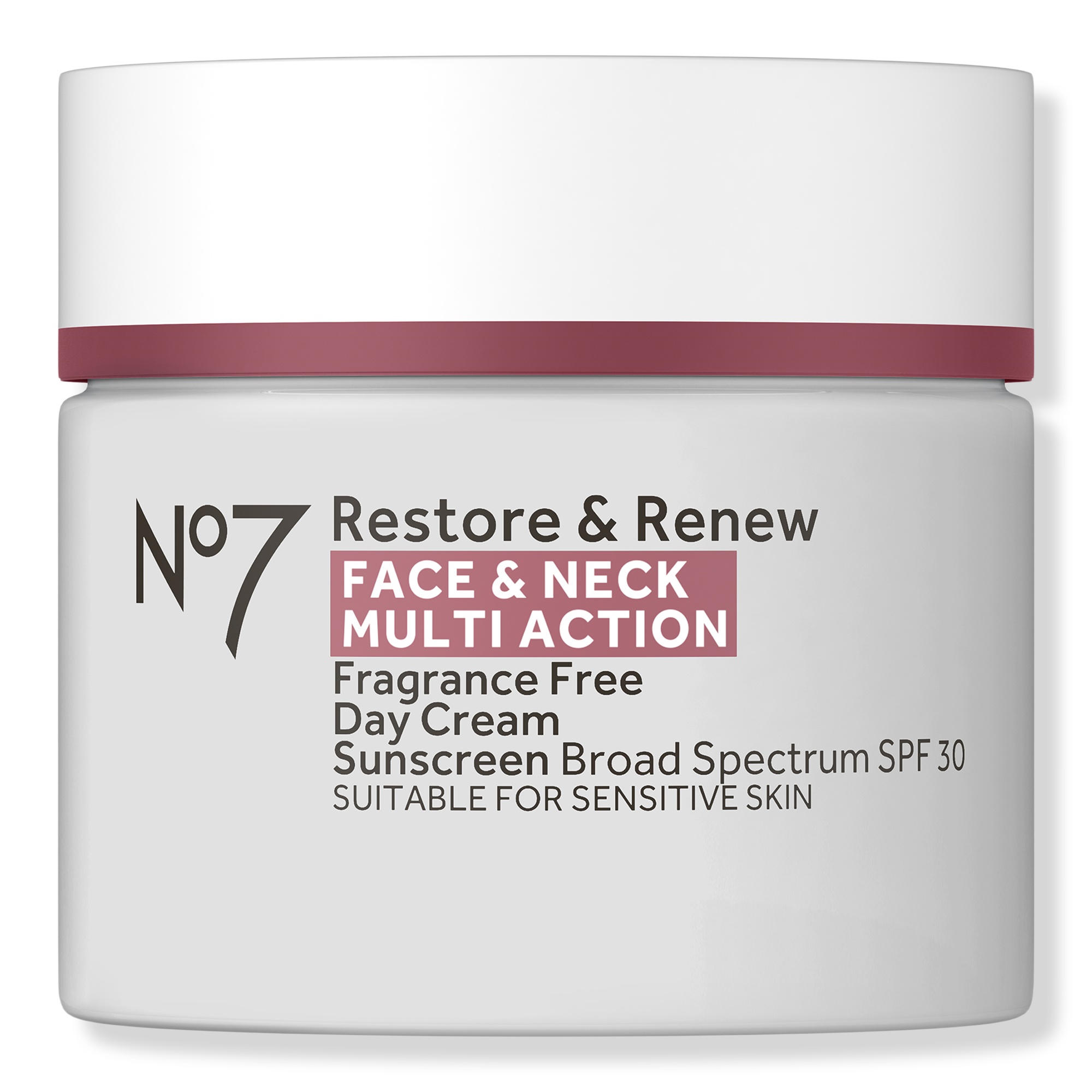 Now fragrance free and ideal for sensitive skin, No7 Restore Renew Face Neck Multi Action Fragrance Free Cream SPF 30 helps protect skin from future signs of aging.