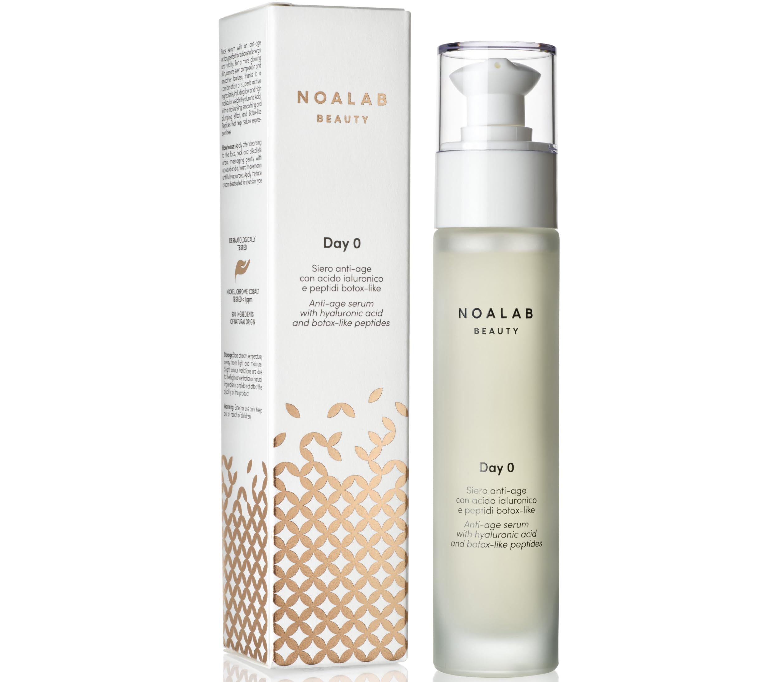 This anti-aging face serum is perfect for boosting energy and vitality. It gives the skin a more radiant appearance, a more even complexion, and more defined features, thanks to the synergistic action of its precious active ingredients. INSTRUCTIONS FOR USE For external use only. Do not swallow. Keep out of reach of children. Store at room temperature, away from light and moisture. Slight variations in color are due to the high concentration of naturally derived ingredients and do not affect the quality of the product. SAFETY WARNING For external use only. Do not swallow. Keep out of reach of children. Store at room temperature, away from light and moisture. Slight variations in color are due to the high concentration of naturally derived ingredients and do not affect the quality of the product. See moreIdeal for Anyone who wants a product rich in functional substances that help prevent and combat the signs of aging. Recommended for ages 25 and up, suitable for all skin types. Directions: After thorough cleansing, apply to the face, neck, and décolleté, massaging gently until fully absorbed. Continue your beauty routine by applying the most suitable face cream for your skin type. Tested by the University of Ferrara: This product is formulated with 90 naturally derived ingredients dermatologically tested by the University of Ferrara nickel, chromium, and cobalt tested 1 ppm. Contains: High and low molecular weight hyaluronic acid: hydrating, plumping, and smoothing acetyl hexapeptide-30 and acetyl oxyceptide-3: combat expression lines vitamin E: antioxidant hydroxypropylene and glucosamine: hydrating and firming. ISABOLOL: soothing, softening red screw extract: antioxidant, protects the skin against smoke, pollution, and wind organic cornflower extract: softening, soothing, and moisturizing organic sweet almond extract: soothing, elasticizing. Special Feature Each Noalab cosmetic contains several active ingredients, guaranteeing multiple benefits in a single step. Day 0 is an anti-aging serum, perfect for boosting energy and vitality. It gives the skin a more radiant appearance, a more even complexion, and more defined features, thanks to the synergistic action of its precious active ingredients. Made in Italy: anti-aging serum with hyaluronic acid and Botox-like peptides, designed and manufactured in Italy.DAY 0 Sérum Visage Antiage avec Acide Hyaluronique, Peptides Botox-Like, Vitamine EDESCRIPTION DU PRODUIT DESCRIPTION DU PRODUIT Sérum visage à action anti-âge, parfait pour une recharge d'énergie et de vitalité. Il donne à la peau un aspect plus radieux, un teint plus uniforme et des traits plus étendus, grâce à l'action synergique de ses précieux actifs. MODE D'EMPLOI Usage extérieur uniquement. Ne pas avaler. Tenir hors de portée des enfants. Conserver à température ambiante, à l'abri de la lumière et de l'humidité. De légères variations de couleur sont dues à la forte concentration d'ingrédients d'origine naturelle qui n'affectent pas la qualité du produit. AVERTISSEMENT DE SÉCURITÉ Usage extérieur uniquement. Ne pas avaler. Tenir hors de portée des enfants. Conserver à température ambiante, à l'abri de la lumière et de l'humidité. De légères variations de couleur sont dues à la forte concentration d'ingrédients d'origine naturelle qui n'affectent pas la qualité du produit. Voir plusIdéal pour Tous ceux qui veulent un produit riche en substances fonctionnelles qui aident à prévenir et à lutter contre les signes du temps. Recommandé à partir de 25 ans, convient à tous les types de peau. Mode d'emploi : appliquer après un nettoyage précis sur le visage, le cou et le décolleté, en massant doucement jusqu'à absorption complète. Poursuivre la routine de beauté avec l'application de la crème visage la plus adaptée en fonction de votre type de peau. Testé par l'université de Ferrara : ce produit est formulé avec 90 d'ingrédients d'origine naturelle testé dermatologiquement par l'Université de Ferrara nickel, chrome et cobalt testé 1 ppm. Contient : acide hyaluronique à haut et bas poids moléculaire : hydratant, repulpant et lissant acétyl Hexapeptide-30 et acétyl oceptide-3 : combattent les rides d'expression vitamine E : antioxydant hydroxypropylène et glucosamine : hydratants. et élastiques. ISABOLOL : apaisant, adoucissant extrait de vis rouge : antioxydant, protège la peau contre la fumée, la pollution et le vent extrait de bleuet bio : adoucissant, apaisant et hydratant extrait d'amande douce bio : apaisant, élastique. Particularité Chaque cosmétique Noalab renferme plusieurs principes actifs, pour vous garantir plusieurs actions en un seul geste. Day 0 est un sérum anti-âge, parfait pour une recharge d'énergie et de vitalité. Il donne à la peau un aspect plus radieux, un teint plus uniforme et des traits plus étendus, grâce à l'action synergique de ses précieux actifs. Fabriqué en Italie : sérum anti-âge avec acide hyaluronique et peptides botox-like, conçu et fabriqué en Italie.
