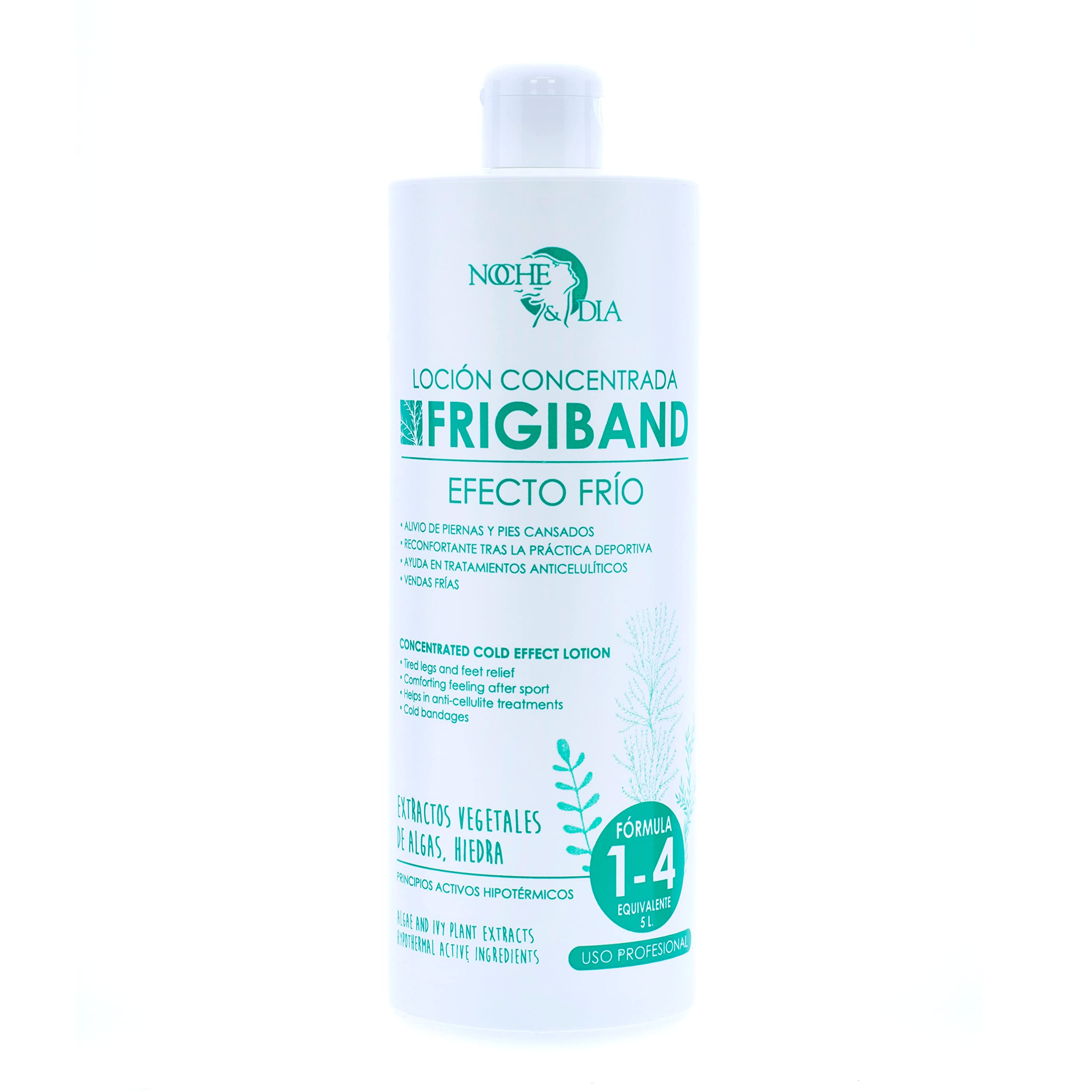 Say goodbye to inflammation and give your legs the relaxation they need with Frigiband Day Night Concentrated Lotion, a professional cold pack liquid that will help you feel better after a day of intense activity or sports. Designed to provide immediate relief, this treatment is ideal for tired legs and aching feet. Thanks to its cooling effect, it activates circulation, reducing swelling and providing a long-lasting feeling of freshness. This professional cold pack liquid is also ideal for aesthetic treatments to reduce cellulite and localized fat. Its advanced formula has been developed to promote muscle recovery and a feeling of lightness in the legs. Apply easily and enjoy a revitalizing effect in minutes. Rediscover the comfort and well-being of your legs with every application. SAFETY WARNING For external use only. Avoid contact with eyes.Treat your legs well: Noche y Día's FRIGIBAND concentrated lotion comes in a 1000 ml bottle, ideal for extended use, improving your well-being and ensuring relaxation for tired legs. Directions for use: Apply directly to the affected area with gentle massage to help relax your muscles. You can also soak your feet in a container of the lotion diluted in a ratio of one part product to four parts water. Alternatively, soak cold packs or bandages in this mixture and apply them to the desired area for 45 minutes. Ideal for anti-cellulite treatments: Thanks to its hypothermic active ingredients, it's an excellent complement to anti-cellulite treatments, promoting the reduction of localized fat and sculpting the silhouette. Natural ingredients: Its formula, enriched with plant extracts such as ivy and Fucus seaweed extracts, stimulates blood and lymphatic microcirculation, helping to reduce inflammation and improve skin firmness. Say goodbye to inflammation with this professional cold compress liquid. Immediate relief for tired legs: Noche y Día's concentrated FRIGIBAND lotion helps legs recover after intense physical activity or sports. It provides a cooling sensation by producing a 3-5 degree cooling effect on the applied area. Its cooling effect provides instant relief.Noche y Día Frigiband Lotion effet froid pour jambes fatiguées, liquide pour bandages froids, réducteur et raffermissant, avec algues fucus, lierre et actifs hypothermiques, 1000 mlDESCRIPTION DU PRODUIT DESCRIPTION DU PRODUIT Dites adieu à l'inflammation et donnez-vous la relaxation dont vos jambes ont besoin avec la lotion concentrée Frigiband Nuit et Jour, un liquide pour bandages froids professionnel qui vous aidera à vous sentir mieux après une journée d'activités intenses ou de pratique sportive. Conçu pour apporter un soulagement immédiat, ce traitement est idéal pour les jambes fatiguées et les pieds douloureux. Grâce à son effet froid, il active la circulation, réduisant le gonflement et offrant une sensation de fraîcheur durable. Ce liquide pour bandage froid professionnel est idéal pour les traitements esthétiques pour la réduction de la cellulite et de la graisse localisée. Sa formule avancée a été développée pour favoriser la récupération musculaire et la sensation de légèreté dans les jambes. Appliquez facilement et profitez d'un effet revitalisant en quelques minutes. Retrouvez le confort et le bien-être de vos jambes à chaque application. AVERTISSEMENT DE SÉCURITÉ Uniquement pour usage externe, éviter tout contact avec les yeux.Donnez du bien à vos jambes : la lotion concentrée FRIGIBAND de Noche y Día est livrée dans une bouteille de 1 000 ml, idéale pour une utilisation prolongée, améliorant votre bien-être et assurant la relaxation de vos jambes fatiguées. Mode d'emploi : appliquer directement sur la zone à traiter avec des massages doux, ce qui aide à la relaxation de vos muscles. Vous pouvez également tremper vos pieds dans un récipient contenant la lotion diluée dans des proportions d'une partie du produit pour 4 doses d'eau. En outre, dans ce mélange, vous pouvez tremper des collants ou des bandages froids et les appliquer sur la zone souhaitée pendant 45 minutes. Idéal pour les traitements anti-cellulite : grâce à ses principes actifs hypothermiques, c'est un excellent choix pour compléter les traitements anti-cellulite, favorisant la réduction de graisse localisée et sculptant la silhouette. Ingrédients naturels : sa formule enrichie en extraits végétaux tels que le lierre et les extraits d'algues Fucus stimule la microcirculation sanguine et lymphatique, aidant à réduire l'inflammation et à améliorer la fermeté de la peau. Dites adieu aux inflammations avec ce liquide de bandage froid professionnel. Soulagement immédiat des jambes fatiguées : la lotion concentrée FRIGIBAND de Noche y Día aide à la récupération des jambes après des activités physiques intenses ou une pratique sportive. Fournit une sensation de fraîcheur en produisant un refroidissement de 3 à 5 degrés sur la zone appliquée. Son effet froid procure un soulagement instantané.