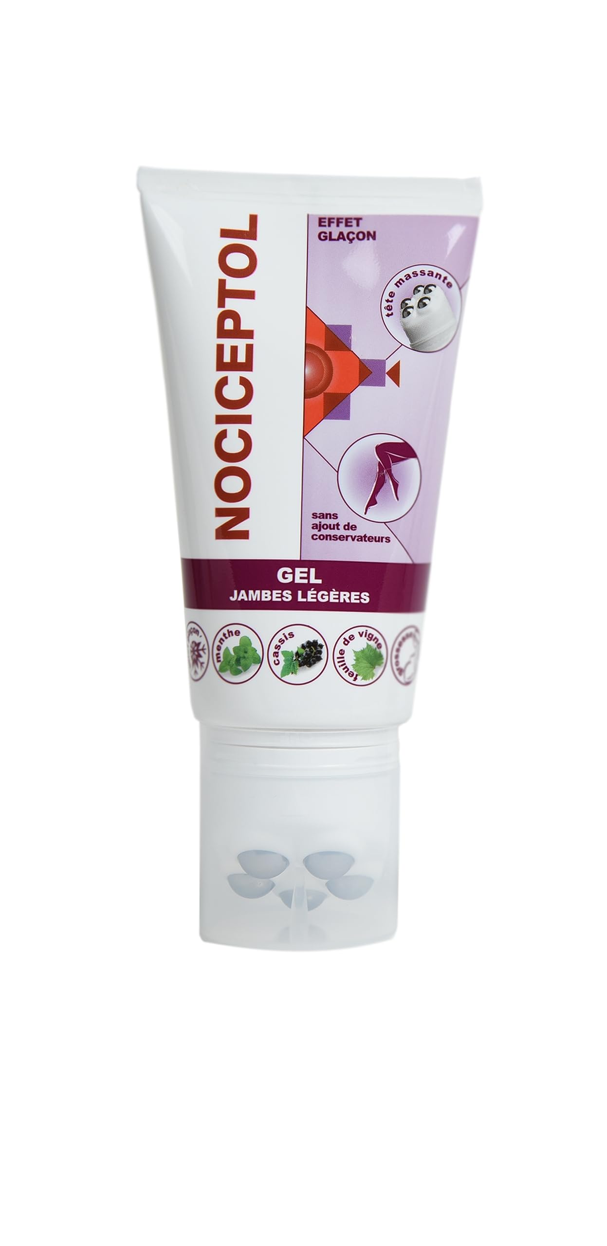 : NOCICEPTOL Light Legs Gel soothes and relieves heavy legs thanks to menthol and peppermint essential oil, which provide immediate freshness and a feeling of well-being. Blackcurrant and red vine extracts, traditionally recognized for their benefits to circulatory comfort, provide their natural benefits. Directions for use: Turn the tube head to the "ON" position. Apply a thin layer of NOCICEPTOL Light Legs Gel, massaging gently with small circular motions from the soles of the feet upwards along the legs, 2 to 3 times a day. At the end of the application, turn the tube head to the "OFF" position to stop the gel dispensing. Spread evenly. Polidis Laboratory specializes in pain relievers, food supplements, pregnancy and ovulation tests, and condoms. All their products are designed with a focus on quality and innovation. This French manufacturer has an excellent reputation, making it a preferred partner of the French pharmaceutical industry. The laboratory has a quality assurance and regulatory affairs department to ensure complete compliance with current regulations. Ingredients: Aqua, ppg-1-peg-9 lauryl glycol ether, alcohol, menthol, mentha piperita oil, propylene glycol, aqua, vitis vinifera leaf extract, carbomer, propylene glycol, aqua, ribes nigrum fruit extract, sodium hydroxide, citric acid. Instructions for use MASSAGE HEAD: Apply the gel to your legs, gently massaging with the massage head equipped with 5 metal rollers for a refreshing and soothing effect. Thanks to its mechanical action, the massage head promotes better venous return. STORAGE: store the product at a temperature below 25 C, away from light and moisture. USE: Apply the gel by gently massaging it onto your legs, from the bottom up, as often as needed. For optimal use, use the product in conjunction with compression stockings or socks. PREGNANCY: This cooling leg gel can be used by pregnant women at a dose of 3g day. COMPOSITION: The product contains no preservatives. Safety Warning: This product should not be used by people allergic to any of its components. Keep out of reach of children. Discontinue use if irritation occurs. See more