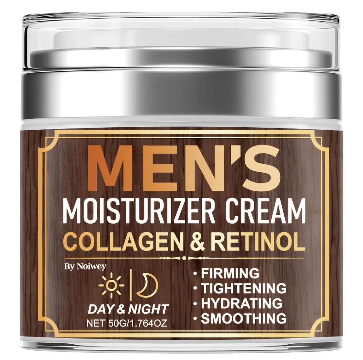 TARGETED FOR MEN: Specially formulated moisturizing cream designed to address men's specific skincare needs. PREMIUM PACKAGING: Sleek silver jar with clear protective lid ensures product freshness and convenient application. MULTI-BENEFIT SOLUTION: Comprehensive skincare cream that firms, tightens, hydrates, and smooths the skin's appearance. DAY NIGHT USE: Versatile moisturizer suitable for both morning and evening skincare routines, packaged in a 1.764oz 50g jar. POWERFUL FORMULA: Advanced moisturizer cream containing collagen and retinol for superior skin firming and tightening effects.