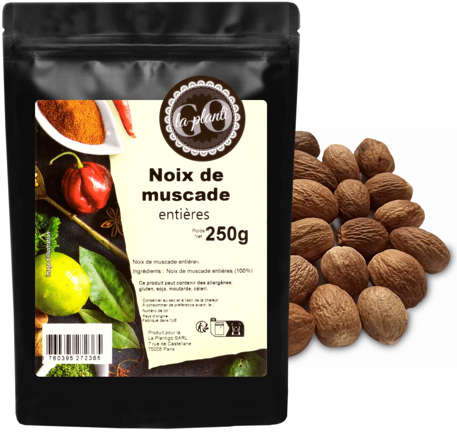 Ingredients: Whole nutmeg (100 ) Allergen Information: This product may contain the following allergens: gluten, soy, mustard, celery. Packaging Method: The product is packaged in thick, doypack-style pouches. The packaging has a welded drawstring closure, allowing for easy opening and resealing multiple times. Thanks to this simple technology, the product retains its freshness. Its organoleptic properties remain unchanged throughout its shelf life. Thanks to high sales volumes and our stock rotation, LA PLANTIGO products are always fresh, which encourages bulk purchases and stocking up on food in the home pantry. Ingredients: Whole nutmeg (100 )Added to meat, dairy products, soups, or breads, it transforms the flavor of dishes in a surprising way. Nutmeg is used in cooking primarily to enhance cakes, gingerbread, and desserts. It is characterized by a wonderfully spicy and extremely refreshing aroma, as well as an intense flavor that is both slightly bitter and sweet. Nutmeg is a very popular and appreciated spice in many cuisines around the world.Description du produit Ingrédients : Noix de muscade entières (100 ) Information sur allergènes : Ce produit peut contenir les allergènes : gluten, soja, moutarde, céleri. Méthode d'emballage : Le produit est emballé dans des sachets épais de type « doypack ». L'emballage a une fermeture à cordon soudé, ce qui permet l'ouverture et la fermeture facile plusieurs fois. Grâce à cette technologie simple le produit garde sa fraicheur. Ses propriétés organoleptiques ne changent pas pendant toute la durée de conservation. Grâce aux volumes de ventes important et la rotation de nos stocks, les produits LA PLANTIGO sont toujours frais, ce qui favorise les achats en gros et le stockage des aliments dans le garde-manger à la maison. Ingrédients Noix de muscade entières (100 )Ajoutée à la viande, aux produits laitiers, aux soupes ou aux pains, elle transforme étonnamment le goût des plats. La noix de muscade est utilisée en cuisine essentiellement pour agrémenter les gâteaux, les pains d'épices et les desserts. Elle se caractérise par un merveilleux arôme épicé et extrêmement rafraîchissant, ainsi que par un goût intense, à la fois légèrement amer et sucré. La noix de muscade est une épice très populaire et appréciée dans de nombreuses cuisines du monde entier.Noix de muscade entières 250 g - LA PLANTIGO