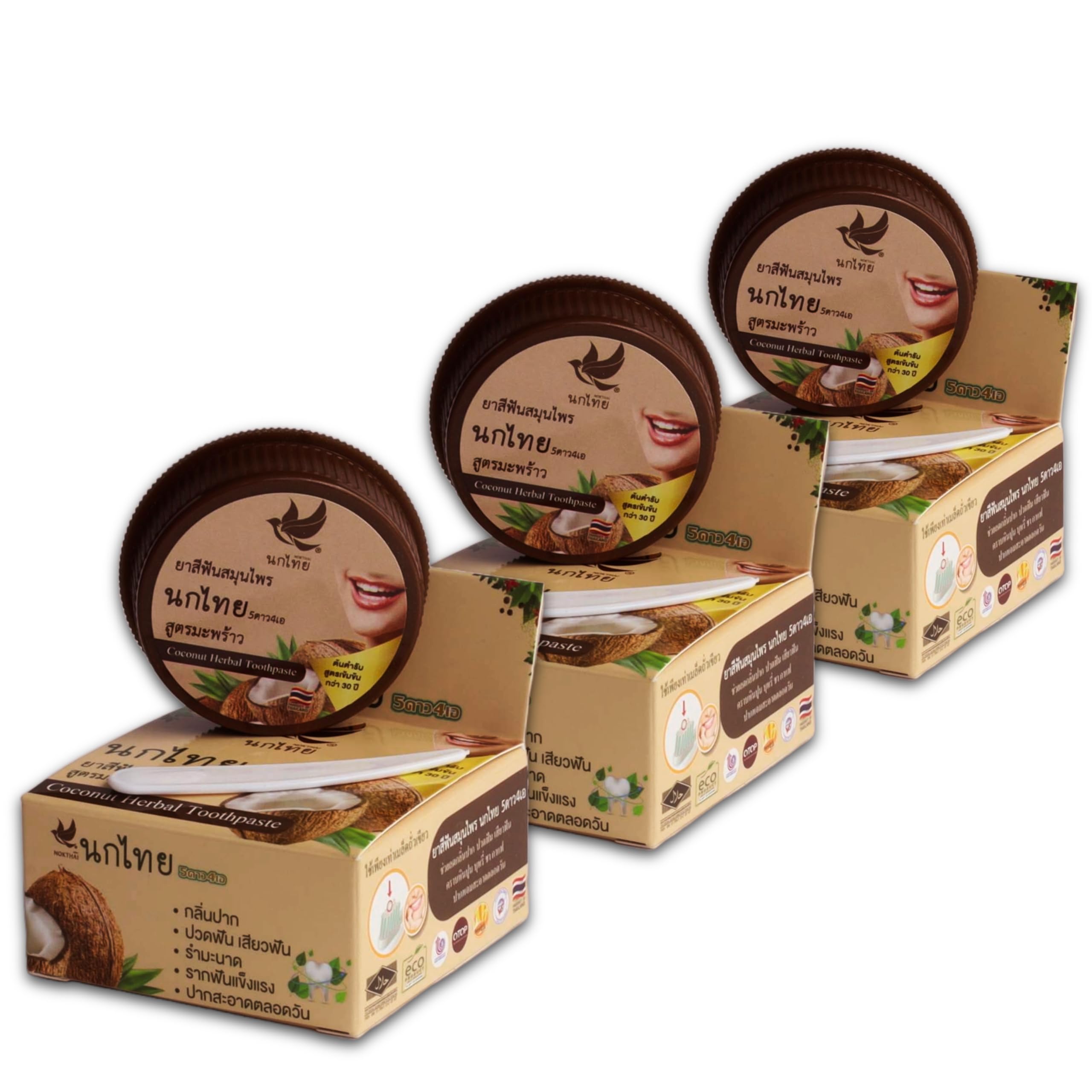 This concentrated whitening herbal toothpaste is designed for those who want a noticeably brighter smile using the most natural ingredients possible. The formula combines a mild coconut flavor with selected Thai herbs to thoroughly clean teeth while gradually whitening them. The gentle formula helps remove surface stains caused by coffee, tea, red wine, or tobacco. This allows the natural white tone of your teeth to be revealed step by step, without harsh chemical bleaching agents. The herbal extracts also provide a lasting feeling of freshness and contribute to a healthy oral flora. Because it is a highly concentrated toothpaste, only a very small amount is needed for each use. Each 25g tube is therefore particularly economical and ideal if you have limited space in your bathroom or toiletry bag. The 3-pack is suitable for both daily use at home and for travel. Benefits at a glance: Concentrated whitening toothpaste for a brighter smile. Mild coconut flavor for a pleasant brushing experience. Thai herbs promote fresh breath and healthy gums. No harsh chemical bleach. Compact and generous tins – ideal for on-the-go: Apply a very small amount of concentrated paste to a moistened toothbrush and brush twice a day as usual. Do not swallow. Suitable for adults and teenagers unless otherwise directed by a dentist. Pack contents: 3 x 25g concentrated whitening toothpaste with coconut and Thai herbs (75g total), NOKTHAI brandPack of 3 convenient 25g tins for home and travel - Ideal for travel, carry-on luggage, the office, or as a supply for several weeks. Highly concentrated formula – Very economical – Thanks to its concentrated texture, a small amount per application is enough, so each 25g tin lasts a long time and is particularly economical. Thai herbs and natural care: Contains selected Thai herbal extracts that support daily oral hygiene, freshen breath, and nourish gums. Mild coconut flavor – Offers a smooth and exotic taste experience while brushing and promotes fresh breath. Powerful whitening effect: Concentrated whitening toothpaste designed to reduce surface discoloration and gradually restore the natural white tone of teeth.NOKTHAI Lot de 3 dentifrices blanchissants concentrés à base de noix de coco et herbes thaïlandaises - Dentifrice blanchissant naturel - 3 x 25 gDESCRIPTION DU PRODUIT Ce dentifrice concentré aux herbes blanchissantes a été conçu pour ceux qui veulent un sourire visiblement plus lumineux avec les ingrédients les plus naturels possibles. La formule combine un goût doux de noix de coco avec des herbes thaïlandaises sélectionnées pour nettoyer les dents en profondeur tout en les éclaircissant progressivement. La formule douce aide à éliminer les taches superficielles causées par le café, le thé, le vin rouge ou le tabac. Ainsi, le ton blanc naturel des dents peut être révélé étape par étape, sans agents de blanchiment chimiques agressifs. Les extraits d'herbes contenus apportent en outre une sensation de fraîcheur durable et contribuent à une flore buccale soignée. Comme il s'agit d'un dentifrice très concentré, une très petite quantité suffit à chaque utilisation. Chaque boîte de 25 g est donc particulièrement économique et idéale si vous avez peu de place dans la salle de bain ou dans la trousse de toilette. Le lot de 3 convient aussi bien pour un usage quotidien à la maison que pour emporter en voyage. Avantages en un clin d'œil : dentifrice blanchissant concentré pour un sourire plus radieux Goût de noix de coco doux pour une expérience de brossage agréable Les herbes thaïlandaises favorisent une haleine fraîche et des gencives soignées Sans javel chimique agressif Boîtes compactes et riches – Idéal pour les déplacements : appliquer une très petite quantité de pâte concentrée sur une brosse à dents humidifiée et 2 dents fois par jour comme d'habitude. le nettoyage. Ne pas avaler. Convient aux adultes et aux adolescents, sauf indication contraire du dentiste. Contenu de l'emballage : 3 x 25 g de dentifrice blanchissant concentré à base de noix de coco et herbes thaïlandaises (75 g au total), marque NOKTHAILot de 3 boîtes de 25 g pratiques pour la maison et les déplacements - Idéal pour les voyages, les bagages à main, le bureau ou comme réserve pendant plusieurs semaines. Formule hautement concentrée – Très économique – Grâce à sa texture concentrée, une petite quantité par application suffit pour que chaque pot de 25 g dure longtemps et est particulièrement économique. Herbes thaïlandaises et soins naturels : contient des extraits d'herbes thaïlandaises sélectionnés qui soutiennent l'hygiène buccale quotidienne, rafraîchissent l'haleine et nourrissent les gencives. Saveur de noix de coco douce – Offre une expérience gustative onctueuse et exotique lors du brossage des dents et favorise une haleine fraîche. Effet blanchissant puissant : dentifrice blanchissant concentré conçu pour réduire la décoloration superficielle et restaurer progressivement le ton blanc naturel des dents.