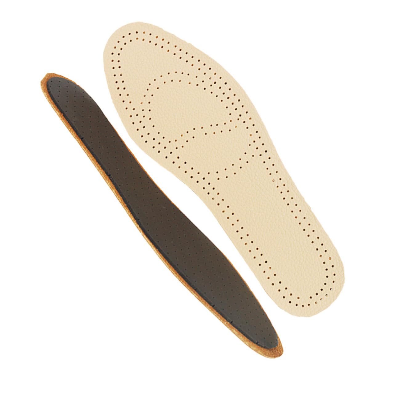 Package Include 2 x pair of insoles Characteristics - Size 39-40: About 25.5x8.6x0.3cm breathable insoles. - Material: Cowhide, latex cowhide insoles. - Size 45-46: About 28.5x9.4x0.3cm sports insoles. - Size 35-36: About 23.5x8x0.3cm. - Size Chart: - Size 43-44: About 27x9x0.3cm. - Size 41-42: About 26.5x8.8x0.3cm. - Color: Beige. - Size 37-38: About 24.8x8.4x0.3cm. - cowhide and latex, durable to use leather insoles. - Suits for any shoe use sports shoe pads. - and comfortable material can reduce feet pressure and fatigue. - Adoption of material, the insole is excellent in shock-aborption and reducing stress. - Leather texture is clear, firm, good permeability. Goods Description Athlete Leather Insoles Are you looking for a pair of comfortable insoles for yourself or your families? Come to see this new leather insoles! It is made by the superior leather material for durable use and longterm using.Foot Protector You will love to wear it because it is breathable, and odor-resistant.Shoe Accessory It is suitable for all adults