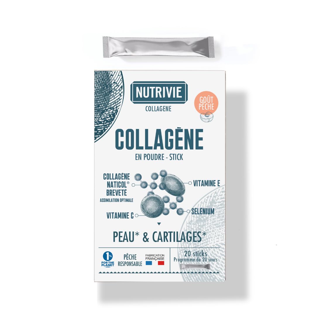 FRENCH EXPERTISE. All Nutrivie food supplements are designed and manufactured in France. They are regulated and controlled by independent certified laboratories. FOR WHOM? Ideal if you: Are looking for comprehensive care for your skin and skeletal system Live an active lifestyle and want to protect yourself from the effects of stress Experience joint discomfort Find your skin less firm and marked.". WHY NATICOL TYPE I MARINE COLLAGEN? This high-quality hydrolyzed marine collagen, extracted from sustainably caught wild fish, is Friend of the Sea Certified. It offers superior bioavailability thanks to its hydrolyzate composition, allowing for optimal absorption and targeted action on tissues. ". ENRICHED WITH ANTIOXIDANTS AND VITAMINS - The presence of vitamin C in our formula promotes normal collagen formation for optimal skin, bone, and cartilage function. In addition, selenium and vitamin E, two powerful antioxidants, help protect cells from oxidative stress. This combination of ingredients from Nutrivie aims to slow the effects of aging, offering a complete solution for skin and joint wellness. ? 4,000 MG OF NATICOL MARINE COLLAGEN WITH PROVEN EFFECTIVENESS. With age, collagen density decreases, leading to a loss of skin firmness and joint discomfort. Our supplement, dosed at 4,000 mg of Collagen per serving, helps improve skin radiance and even skin tone, while supporting bone and joint health.SAVOIR-FAIRE FRANÇAIS. Tous les compléments alimentaires Nutrivie sont conçus et fabriqués en France. Ils sont réglementés et contrôlés par des laboratoires certifiés indépendants. POUR QUI ? Idéal si vous : Cherchez un soin global pour votre peau et votre système osseux Vivez un rythme de vie actif et souhaitez vous protéger des effets du stress Ressentez des gênes articulaires Trouvez votre peau moins ferme et marquée.". POURQUOI LE COLLAGÈNE MARIN NATICOL DE TYPE I ? Ce collagène marin hydrolysé de haute qualité, extrait de poissons sauvages pêchés durablement est Certifié Friend of the Sea. Il offre une biodisponibilité supérieure grâce à sa composition en hydrolysat, permettant une absorption optimale et une action ciblée sur les tissus. ". ENRICHIE EN ANTIOXYDANTS ET VITAMINES - La présence de vitamine C dans notre formule favorise la formation normale de collagène pour une fonction optimale de la peau, des os et des cartilages. En outre, le sélénium et la vitamine E, deux puissants antioxydants, contribuent à protéger les cellules contre le stress oxydatif. Cette combinaison d'ingrédients de Nutrivie vise à ralentir les effets du vieillissement, offrant une solution complète pour le bien-être de la peau et des articulations. ? 4 000 MG DE COLLAGÈNE MARIN NATICOL A l'EFFICACITÉ PROUVÉE. Avec l'âge, la densité du collagène diminue, entraînant une perte de fermeté de la peau et des inconforts articulaires. Notre supplément, dosé à 4 000 mg de Collagène par portion, aide à améliorer l'éclat de la peau et l'homogénéité du teint, tout en soutenant la santé des os et des articulations.