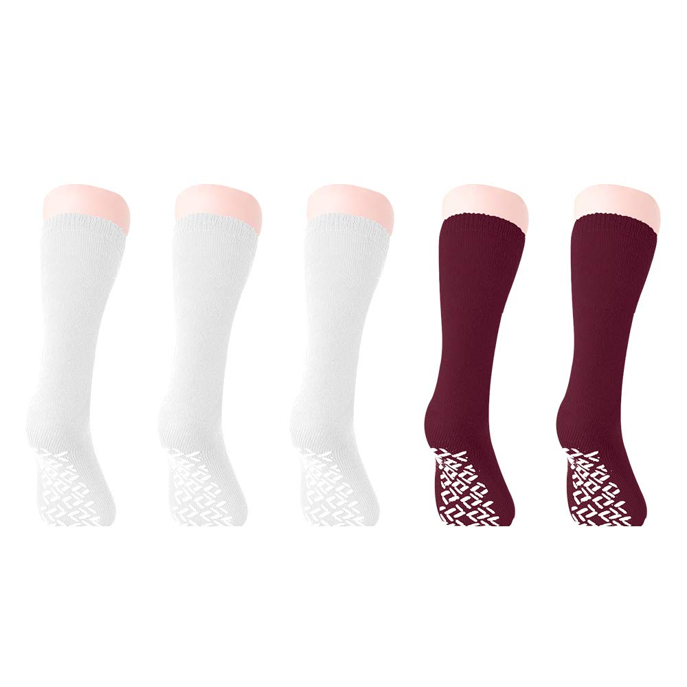 Non Slip Anti Skid Yoga Pilates Hospital Slipper Socks with Gripper Bottoms Mid Calf 5 Pairs (3 White 2 Maroon)