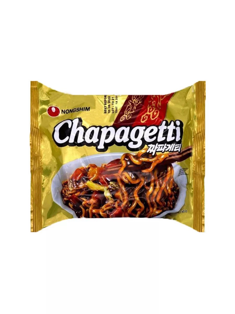 Chapagetti Instant Noodles with Sauce, 140g. Chapagetti is a version of the popular Korean jajangmyeon noodles with chajang black bean sauce from Nongshim. Nongshim spent years developing the recipe and has successfully transformed this popular, yet difficult-to-make noodle into a quick-cook dish. Now you can enjoy this Korean dish at work or at home! Ingredients: noodles (wheat flour, potato starch, palm oil, modified potato starch, salt, seasoning (humectant: E420, sunflower oil), antioxidant (E306), emulsifier (E322 (contains soy)), acidity regulator (E501, E452, E500, E339), color E101, green tea extract; seasoning: spices (soybean paste, corn flour, maltodextrin, salt, onion, palm oil, wheat, shrimp), sugar, caramel powder (maltodextrin, color (E150c), flavor enhancer (631, 627); seasoned oil: vegetable oil (rapeseed, onion, olive, corn, sesame, maid); dried vegetables: textured vegetable protein (defatted soy, wheat gluten), Cabbage, fried potatoes (potatoes, palm oil), onions, carrots. Nutritional and energy value per 100 g: proteins - 7.8 g, fats - 15 g, saturated fats - 5.9 g, carbohydrates - 68 g, 430 kcal. Shelf life: 12 months. Preparation: Place the noodles and dried vegetables in 600 ml (3 cups) of boiling water and simmer for 5 minutes. Remove from heat, drain (reserving about 4 tablespoons of water), add seasoned oil and seasoning. Stir and serve.