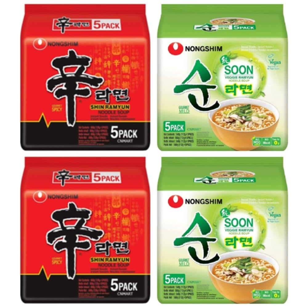 While we work to ensure that product information is correct, on occasion manufactures may alter their ingredient lists. Actual product packaging and materials may contain more and/or different information than that shown our web site. We recommend that you do not solely rely on the information presented and that you always read labels, warnings, and directions before using or consuming a product. For additional information about a product, please contact our customer service or the manufacturer. INGREDIENTS Shin Ramyun: Noodle: Wheat Flour (71%), Palm Oil, Potato Starch, Salt, Acidity Regulator: E501, E339, E500, Tocopherol Liquid (Antioxidant: E306, Emulsifier: E322 (contains soy)), Seasoning (Yeast Extract, Soy Sauce, Garlic, Wheat Starch)), Green Tea Extract (Oligosaccharides, Tea Catechin, Acid:E330), Colour E101. Soup Powder: Salt, Spices (Red Pepper, Garlic, Black Pepper, Onion Powder), Flavour Enhancers: E621 E627 E631, Sugar, Soy Bean Paste Powder (Wheat Flour, Soy Bean, Salt). Vegetable Flakes: Green Onion, Dried Carrot, Dried Mushroom, Chili Pepper. Soon Veggie Ramyun: Enriched wheat flour (wheat flour, niacin, reduced iron, thiamine mononitrate, riboflavin, folic acid), palm oil, potato starch, modified potato starch, salt, contains less than 2% of the following: powdered black pepper, citric acid, dehydrated vegetables (choy sum, carrot), dextrose, disodium inosinate, disodium succinate, powdered garlic, powdered ginger, powdered green onion, green tea extract, gum arabic, high fructose corn syrup, hydrolyzed soy protein, hydrolyzed wheat protein, powdered kelp extract, soy lecithin, maltodextrin, modified corn starch, modified tapioca starch, powdered mushroom extract, natural vegan flavors, powdered onion, polyglycerol esters of fatty acids, potassium carbonate, powdered radish extract, powdered red chili pepper, riboflavin (color), rice flour, powdered shiitake mushroom, sodium carbonate, sodium phosphates, powdered soy sauce (wheat, soy, salt), powdered soybeans, non-bone char sugar, tocopherols (antioxidant), wheat starch, yeast extract, yellow corn flour. DIRECTIONS 1. Add noodles into 500ml of boiling water and cook for 3 minutes. Add soup base into bowl in advance. 2. Remove from heat. Pour hot water into bowl to melt soup base, then add noodles, stir and enjoy it! See moreBoxed By CNMART. Food Allergy Notice: Check ingredients on packaging for allergies or dietary requirements. Contact customer service with questions before ordering. Your ideal meal within minutes! Just boil water, add noodles and soup mix, simmer for 3 minutes, and enjoy. This bundle includes two popular flavours: Shin Ramyun and Soon Veggie Ramyun - a taste of Korea in your kitchen. Package Includes: A set of 20 Nongshim Ramyun packs, composed of 10 packs of Shin Ramyun and 10 packs of Soon Veggie Ramyun.