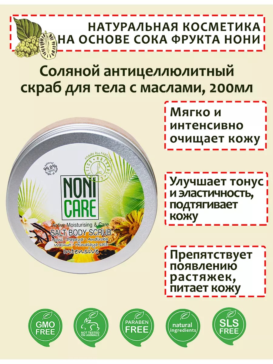 | Полное наименование товара | Скраб для тела соляной с маслом ши, лемонграсса, андиробы NONICARE 200мл |
