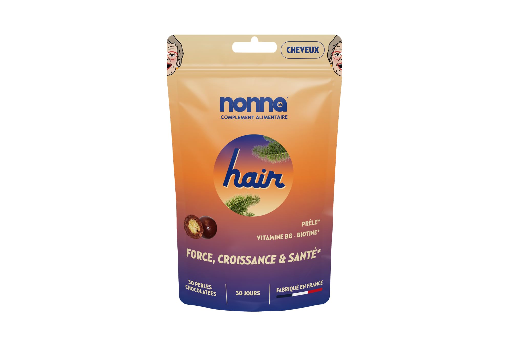 HEALTH NUTRITION LABORATORY: NONNA LAB is committed to improving everyone's health every day while guaranteeing performance, quality, and pleasure. Its expertise is based on high-concentration formulas with increased bio-assimilation, developed with meticulous precision, and based on nutritious and active food matrices. Made in France, without GMOs or additives. ZERO GUILT: Transform your hair treatment into a moment of pleasure. Crunchy puffed wheat center, low-sugar milk chocolate, no colorings or preservatives, and fairly sourced cocoa beans. No added sugar. 1 pearl per day and no more. EFFECTIVE SOLUTION FOR PLEASURE: The hair fortifying treatment, NONNA HAIR revolutionizes hair care thanks to its innovative approach that combines the best of science and pleasure. Chocolate pearls as concentrated as capsules, with added pleasure. ULTRA COMPLETE FORMULA: A true concentration of active nutrients, essential for beautiful, healthy-looking hair: biotin, vitamin B6, selenium zinc. Enriched with Field Horsetail to promote hair growth. NEW VITALITY: NONNA Hair restores new vitality to hair with its innovative formula, designed to make it stronger, longer and more beautiful. This unique treatment restores strength and resistance, while actively promoting hair growth and growth.LABORATOIRE DE NUTRITION SANTÉ: NONNA LAB s'engage à améliorer la santé de chacun au quotidien tout en garantissant performance, qualité et plaisir. Son expertise repose sur des formules haute concentration à la bio-assimilation augmentée, élaborées avec une précision méticuleuse, et reposant sur des matrices alimentaires nutritives et actives. Fabriqués en France, sans OGM ou additif. ZÉRO CULPABILITÉ : Transformez votre cure cheveux en un moment de plaisir. Coeur croquant en blé soufflé, chocolat au lait peu sucré, sans colorants ni conservateurs, et fève de cacao sourcée équitablement. Sans sucre ajouté. 1 perle par jour et pas plus. SOLUTION EFFICACE PAR PLAISIR : La cure fortifiante capillaire, NONNA HAIR révolutionne le soin des cheveux grâce à son approche novatrice qui combine le meilleur de la science et du plaisir. Perles chocolatées aussi concentrées que des gélules, le plaisir en plus. FORMULE ULTRA COMPLÈTE : Véritable concentration de nutriments actifs, essentiels pour avoir de beaux cheveux, éclatants de santé : biotine, vitamine B6, sélénium zinc. Enrichis de Prêle des champs pour favoriser leur croissance. UNE NOUVELLE VITALITÉ: NONNA Hair redonne une nouvelle vitalité aux cheveux avec sa formule innovante, conçue pour les rendre plus forts, plus longs et plus beaux. Ce traitement unique leur redonne force et résistance, tout en favorisant activement leur croissance et leur pousse.