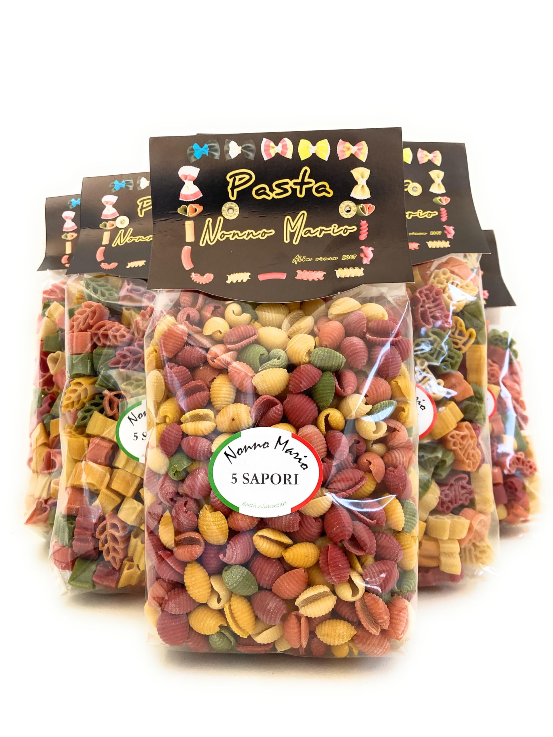 Bring color to the table with our 3kg pantry offer of handcrafted colored pasta: six 500g packs in original shapes and five beautiful natural colors. Each pasta is handcrafted in Italy, without preservatives, and colored exclusively with natural ingredients: green: spinach red: tomato yellow: turmeric burgundy: beetroot white: Italian durum wheat semolina. The six fun shapes—hearts, bicycles, camper vans, gnocchetti, fusilli, and wheat stalks—are designed to delight both young and old, making every meal a special occasion. Perfect with butter and Parmesan cheese, or with vegetable and tomato juices, our pasta cooks in just 5 minutes and retains a great texture. A healthy, cheerful, and 100 Italian product to always keep in your pantry for quick and whimsical meals. Ingredients: durum wheat semolina, dehydrated vegetables in varying proportions. Allergens: contains gluten. Cooking time: 5 minutes INGREDIENTS Spinach, wheat DISCLAIMER Special color on the table. The package contains 3 kg (6 x 500 g packs) of handcrafted colored pasta made without preservatives and with natural colorings from raw materials: the green of spinach, the red of tomato, the yellow of turmeric, the burgundy of beetroot, and the white of durum wheat semolina. 6 attractive shapes (hearts, bicycles, gnocchetti, fusilli, camper van, wheat spighr) to bring color and cheer to your tables. For young and old alike, it will be a celebration! Season with butter and cheese or with any tomato and vegetable sauce. Ingredients: durum wheat semolina, dehydrated vegetables in varying proportions 1.5 (spinach, beetroot, tomatoes, turmeric). Allergens: gluten - Recommended cooking time: 5 min. See moreOffre garde-manger pâtes colorées artisanales grand-père Mario Italia– 6 formats amusants – 3 kg – pâtes italiennes sans conservateurs – avec légumes naturelsDESCRIPTION DU PRODUIT DESCRIPTION DU PRODUIT Apportez la couleur à la table avec notre offre garde-manger de pâte colorée artisanale de 3 kg : six paquets de 500 g avec des formats originaux et cinq superbes couleurs naturelles. Chaque pâte est fabriquée artisanalement en Italie, sans conservateurs et colorée exclusivement avec des ingrédients naturels : vert : épinards rouge : tomate jaune : curcuma bordeaux : betterave blanche : semoule de blé dur italien Les six formats amusants - cœurs, vélos, camping-cars, gnocchets, fusilli et épis de blé - sont conçus pour faire plaisir aux grands et petits, rendant chaque repas une occasion spéciale. Parfaite avec du beurre et du parmesan, ou avec des jus de légumes et de tomates, nos pâtes cuit en seulement 5 minutes et conservent une excellente texture. Un produit sain, joyeux et 100 italien à garder toujours dans le garde-manger pour des repas rapides et fantaisies. Ingrédients : semoule de blé dur, végétaux déshydratés en proportion variable. Allergènes : contient du gluten. Temps de cuisson : 5 minutes INGRÉDIENTS Épinards, blé CLAUSE DE NON-GARANTIE Couleur spéciale sur la table. Le paquet contient 3 kg (6 paquets de 500 g) de pâte colorée produite artisanalement sans conservateurs et avec colorants à partir de matières premières naturelles le vert des épinards, le rouge de la tomate, le jaune du curcuma, le bordeaux de la betterave et le blanc de la semoule de blé dur 6 jolis formats (cœurs, vélos, gnocchets, fusilli, camping-car, spighr de blé) pour apporter de la couleur et une santé Gaieté sur vos tables. Pour les grands et les petits, ce sera une fête ! À assaisonner avec du beurre et du fromage ou avec n'importe quelle sauce de tomate et légumes. Ingrédients : semoule de blé dur, végétaux déshydratés en proportion variable 1,5 (épinards, bille, tomates, curcuma). Allergènes : gluten - Temps de cuisson recommandé : 5 min. Voir plus