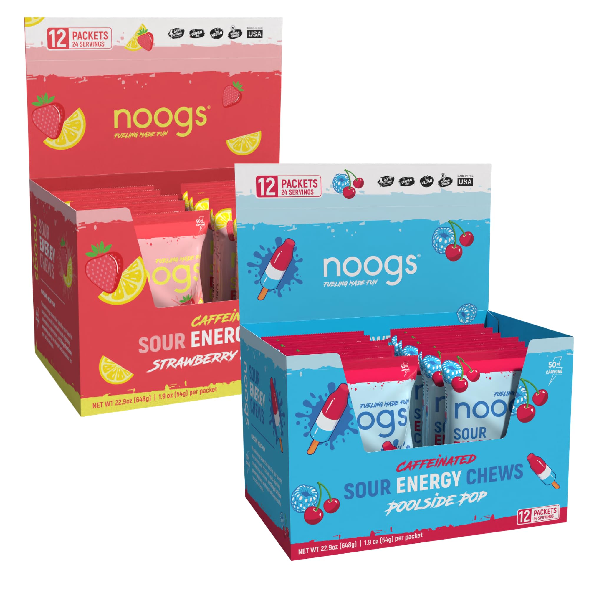 Fuel your workouts with a bold burst of sweet and sour energy. Noogs Sour Energy Chews are designed for endurance athletes, delivering quick-digesting carbohydrates to keep you going strong without the crash. Packed with essential electrolytes, they help replenish lost hydration and prevent muscle cramps, so you avoid bonking and enjoy a fun workout. With a soft, chewy texture, Noogs are easy to eat on the go - no sticky mess or stomach discomfort. Made with dietitian-approved ingredients, they're vegan, gluten-free, and free from artificial sweeteners, giving you the energy you need to have fun and crush your goals. Choose from a variety of delicious, sour candy flavors. Lightweight, portable, and race-ready, Noogs Chews fit easily in your pocket or gym bag, making them a convenient mid-workout fuel. Whether you're a runner, cyclist, or fitness enthusiast, Noogs delivers delicious, performance-driven energy in every bite. Take your endurance to the next level with Noogs, fuel that tastes as good as it performs.CREATED BY A DIETITIAN MARATHONER, woman owned Noogs combines performance fuel with a delicious flavor for the go-to energy source for runners, cyclists, triathletes, and fitness enthusiasts. EASY TO CHEW, EASY TO DIGEST soft, bite-sized chews designed for quick consumption and digestion. SOUR CANDY FLAVOR for a perfect balance of sweetness and tartness. Noogs electrolyte gummies are vegan, gluten free, and made with natural colors and flavors. 50MG OF CAFFEINE for an extra boost during your workouts. Caffeine gummies are easy to chew digest without any sticky texture or stomach discomfort. BUNDLE INCLUDES one box of Strawberry Lemonade and one box of Poolside Pop caffeinated sour chews. Total of 24 packs of Noogs, perfect for running, cycling, endurance, or high-intensity workouts.