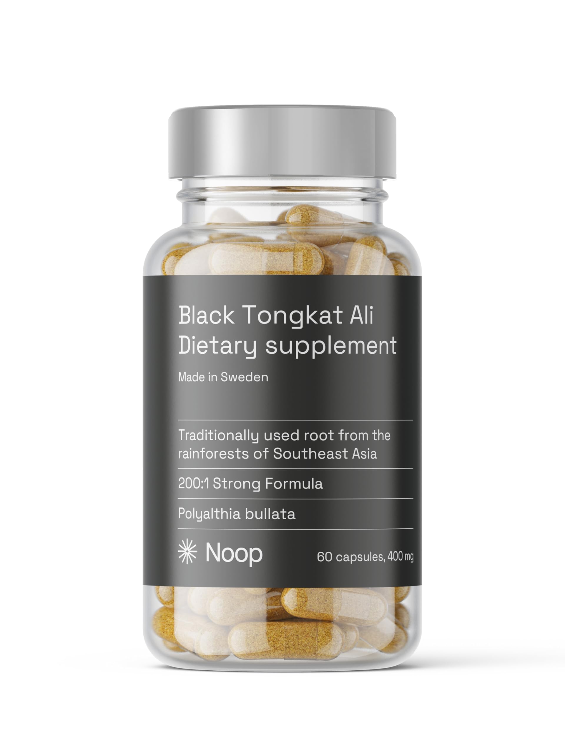 EASY TO USE – 60 testosterone capsules are sufficient for 1-2 months. Recommended daily dose: 1-2 capsules with water. Practical, resealable jar for optimal freshness. Perfect for a daily routine around booster, male vitality and fitness lifestyle. 100 NATURAL VEGAN: herbal capsule shell made of seagrass cellulose. Free from artificial additives, fillers and synthetic ingredients. Suitable for vegetarians and vegans. Supports conscious nutrition in sports, muscle building and recovery. TRADITIONAL PLANTS Extract – Polalthia bullata, also known as Black Tongkat or Longjack, has been prized in Southeast Asia for centuries. A plant-based adaptogen with natural associations with energy balance and general well-being. HIGH CENTERED – 200:1 EXTRACT – Each capsule contains 400 mg of Polalthia bullata extract at a ratio of 200:1. Only 1 kg of high-quality extract is extracted from 200 kg of roots. Ideal for anyone who wants to support their energy, strength and endurance in everyday life or during sports. PREMIUM SWEDISH QUALITY - 400 mg black tongue cat, manufactured in Sweden to pharmaceutical standards. Contains pure Polalthia bullata root extract for maximum purity and reliable quality. Popular in male health, vitality and fitness.NOOP Ton-Kat – Polyalthia bullata Extract, Premium Kwaliteit uit Zweden, 400mg 60 Vegan CapsulesEENVOUDIG GEBRUIK – 60 testosteroncapsules zijn voldoende voor 1-2 maanden. Aanbevolen dagelijkse dosis: 1-2 capsules met water. Praktische, hersluitbare pot voor optimale versheid. Perfect voor een dagelijkse routine rond booster, mannelijke vitaliteit en fitness-levensstijl. 100 NATUURLIJK VEGANISCH: kruiden capsulehuls van zeegrascellulose. Vrij van kunstmatige additieven, vulstoffen en synthetische ingrediënten. Geschikt voor vegetariërs en veganisten. Ondersteunt een bewuste voeding in sport, spieropbouw en herstel. TRADITIONEEL PLANTEN Extract – Polalthia bullata, ook bekend als Black Tongkat of Longjack, wordt al eeuwenlang gewaardeerd in Zuidoost-Azië. Een plantaardig adaptogeen met natuurlijke associatie met energiebalans en algemeen welzijn. HOG GECENTREERD – 200:1 EXTRACT – Elke capsule bevat 400 mg Polalthia bullata-extract in een verhouding van 200:1. Van 200 kg wortels wordt slechts 1 kg extract van hoge kwaliteit gewonnen. Ideaal voor iedereen die zijn energie, kracht en uithoudingsvermogen wil ondersteunen in het dagelijks leven of tijdens het sporten. PREMIUM ZWEEDSE KWALITEIT - 400 mg zwarte tongkat, vervaardigd in Zweden volgens farmaceutische normen. Bevat puur Polalthia bullata root-extract voor maximale zuiverheid en betrouwbare kwaliteit. Populair in mannelijke gezondheid, vitaliteit en fitness.