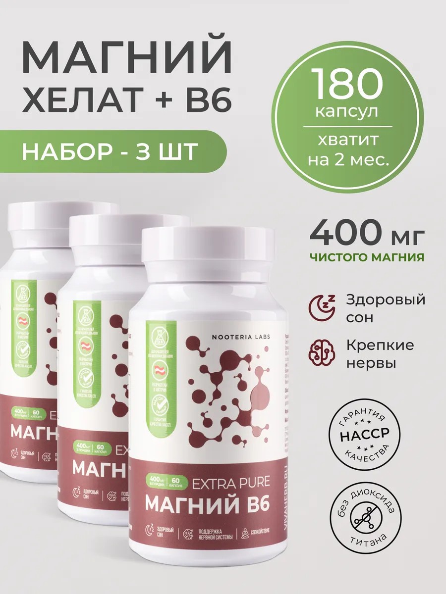 Магний В6 Хелат Бисглицинат EXTRA PURE от Nooteria Labs — это качественный БАД, который поможет вам справиться с чувством стресса и усталостью, улучшить качество сна и общее состояние организма. Уникальная формула, содержащая магний и витамин В6, способствует поддержанию здоровья нервной системы, помогает снизить уровень тревожности и улучшить настроение.