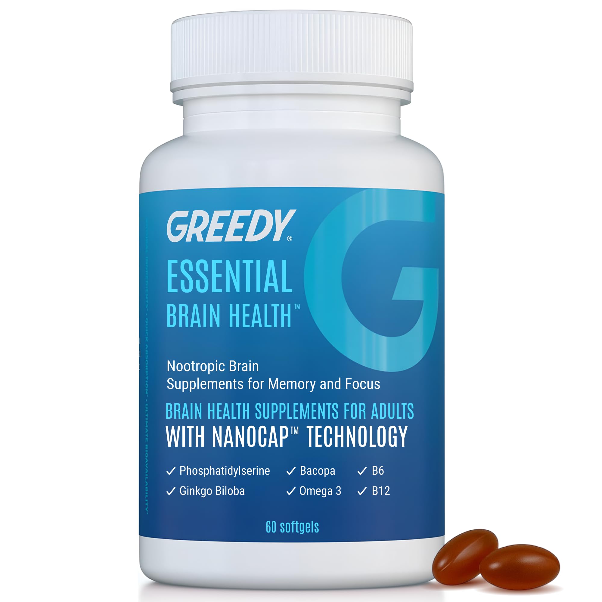 Support healthy cognitive function with Essential Brain Health. This advanced supplement is formulated using our proprietary NanoCap encapsulation, featuring an enteric-coated outer shell with nano-sized ingredients inside. This cutting-edge technology optimizes nutrient delivery for maximum, rapid absorption—helping to support healthy brain function. Our scientifically-backed formula includes omega-3s, bacopa monnieri, acetyl-l-carnitine, ginkgo biloba, phosphatidylserine, and vitamins B6 B12, all known for their role in supporting cognitive performance and mental clarity. These ingredients are clinically-backed and extensively studied for their ability to promote brain function and overall cognitive well-being. Designed for maximum bioavailability, this formula ensures efficient nutrient uptake, helping you stay sharp and adaptable in your daily life. Essential Brain Health is rigorously tested for purity and potency, ensuring it is free from harmful additives and heavy metals. Encapsulated in easy-to-swallow softgels, this supplement seamlessly fits into your daily wellness routine. Prioritize your cognitive support with Essential Brain Health – a smart choice for those looking to maintain mental clarity and optimal cognitive health. Directions: Take 1-2 softgel capsules daily with 8 oz. of water and food. Ingredients: Omega-3s, Bacopa Monnieri, Acetyl-L-Carnitine, Ginkgo Biloba, Phosphatidylserine, Vitamin B6, Vitamin B12, other excipients.Powerful Blend: Includes Omega-3s, Bacopa Monnieri, Acetyl-L-Carnitine, Ginkgo Biloba, and Phosphatidylserine, and Vitamins B6 B12. These scientifically proven ingredients work synergistically to boost clarity, support longevity, and enhance overall cognitive function. Rapid Absorption: Nanoparticles work to pass biological barriers quicker than standard supplements, leading to quick and full absorption. Traditional supplements don't absorb as quickly or effectively due to the acidic environment of the stomach. Ultimate Bioavailability: This innovative technology delivers the full dose of nutrients, providing more efficient cognitive enhancement for superior mental clarity, and total protection. These work especially well for individuals suffering from digestive issues, as their biocompositions have the propensity to lessen bioavailability even further. NanoCap Technology: Our supplement uses our proprietary NanoCap capsule delivery method. With an enteric-coated outer shell and nanoparticle ingredients inside, be part of the next generation of nutrition. This next-gen nanotechnology promotes superior bioavailability and quick absorption, ensuring they reach your intestines before absorbing fully. Complete Brain Support: Enhance memory, mental clarity, and every other cognitive neural biomarker with nanoparticle ingredients. Designed to support cognitive function and overall brain health. Unlock your brain's full potential and achieve optimal mental performance, now and in the long haul.