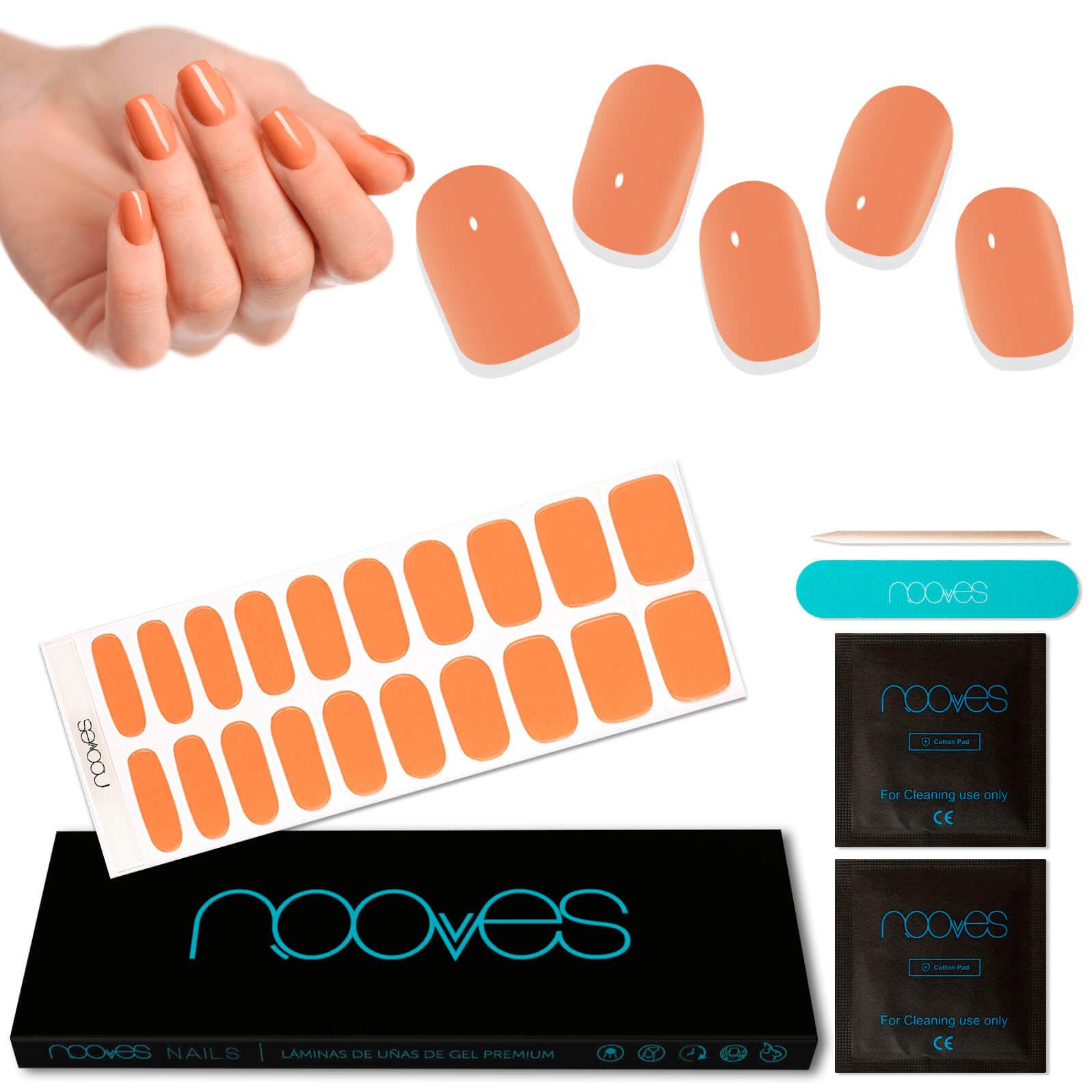 NOOVES - Gel Nail Sheets Orange Glow Orange 20 Pieces, Premium Semi-Cured Gel Nails, Gel Nail Stickers, Gel Nail Decals, Includes 1 Nail File and 1 Orange Stick, Vegan. Includes 20 premium semi-cured gel sheets, 1 orange stick, 1 nail file, and 2 alcohol wipes. Achieve a salon-quality manicure at home. Perfect for brittle, damaged, or allergic nails: NOOVES gel nail sheets provide a protective layer for nails, strengthening them and protecting them from further damage—an extra step compared to adhesive nail stickers or gel nail decals. Our vegan nail films are the perfect choice for those seeking a long-lasting, high-quality manicure that withstands daily wear and tear, ensuring your nails stay flawless for longer. They also act as a protective layer, strengthening your natural nails and preventing damage. They are very easy to apply thanks to their self-adhesive design and are easy to cut to size to fit your nails without any problems. Our films are 100 vegan and cruelty-free. Enjoy a manicure that lasts for weeks without the need for constant touch-ups. Get professional results without leaving home.Spanish brand: Perfect for brittle, damaged, or allergic nails: NOOVES gel nail sheets offer a protective layer, strengthening nails and protecting them from further damage—an extra step compared to adhesive nail stickers or gel decals. How to apply them: 1. Prepare your nails. 2. Select the size. 3. Apply the film to the nail without touching the cuticle. 4. Trim with nail clippers and then file off any excess gel. 5. Cure under a UV LED nail lamp for 60 to 120 seconds. Gel nails: They are highly durable (up to 3 weeks), protect your natural nail without damaging it, are very easy to apply thanks to their self-adhesive design, and are easy to trim, allowing you to adjust the size to your nails without any problems.NOOVES - Lot de 20 feuilles de gel pour ongles - Orange Glow - 20 pièces - Ongles en gel semi-durcis premium - Autocollants pour ongles en gel - Comprend 1 lime à ongles et 1 bâtonnet d'orange,DESCRIPTION DU PRODUIT NOOVES - Feuilles de gel pour ongles Orange Glow Orange 20 pièces, ongles en gel semi-durcis Premium, gel Nail Stickers, autocollants pour ongles en gel, comprend 1 lime à ongles et 1 bâtonnet d'orange, végétalien. Comprend 20 feuilles de gel semi-durci premium, 1 bâtonnet d'orange, 1 lime et 2 tampons imbibés d'alcool. Vous aurez une manucure en salon à domicile. Parfaits pour les ongles cassants, endommagés ou allergiques : les feuilles à ongles en gel NOOVES offrent une couche protectrice aux ongles, les renforçant et les protégeant des dommages supplémentaires, une étape supplémentaire par rapport aux autocollants pour ongles adhésifs ou au gel nails stickers. Nos films pour ongles végétaliens sont le choix parfait pour ceux qui recherchent une manucure durable et de haute qualité, résistante à l'usure quotidienne, garantissant que vos ongles restent impeccables plus longtemps. En outre, ils agissent comme une couche protectrice, renforçant vos ongles naturels et évitant les dommages. Ils sont très faciles à appliquer grâce à leur design auto-adhésif et sont faciles à couper pour ajuster leurs tailles à vos ongles sans aucun problème. Nos films sont 100 végétaliens et sans cruauté envers les animaux. Profitez d'une manucure qui dure des semaines sans avoir besoin de retouches constantes. Obtenez un résultat professionnel sans quitter la maisonMarque espagnole : parfaits pour les ongles cassants, endommagés ou allergiques : les feuilles à ongles en gel NOOVES offrent une couche protectrice aux ongles, les renforçant et les protégeant des dommages supplémentaires, une étape supplémentaire par rapport aux autocollants pour ongles adhésifs ou aux autocollants en gel. Comment les poser ? 1. Préparez vos ongles. 2. Sélectionnez la taille. 3. Appliquez le film sur l'ongle sans toucher la cuticule. 4. Coupez avec un coupe-ongles puis limez l'excédent de gel. 5. Laissez durcir sous la lampe à ongles LED UV pendant 60 à 120 secondes. Ongles en gel : ils ont une grande durabilité (jusqu'à 3 semaines), protègent votre ongle naturel sans l'endommager, sont très faciles à appliquer grâce à leur design autocollant et sont faciles à couper permettant d'ajuster leurs tailles à vos ongles sans aucun problème.