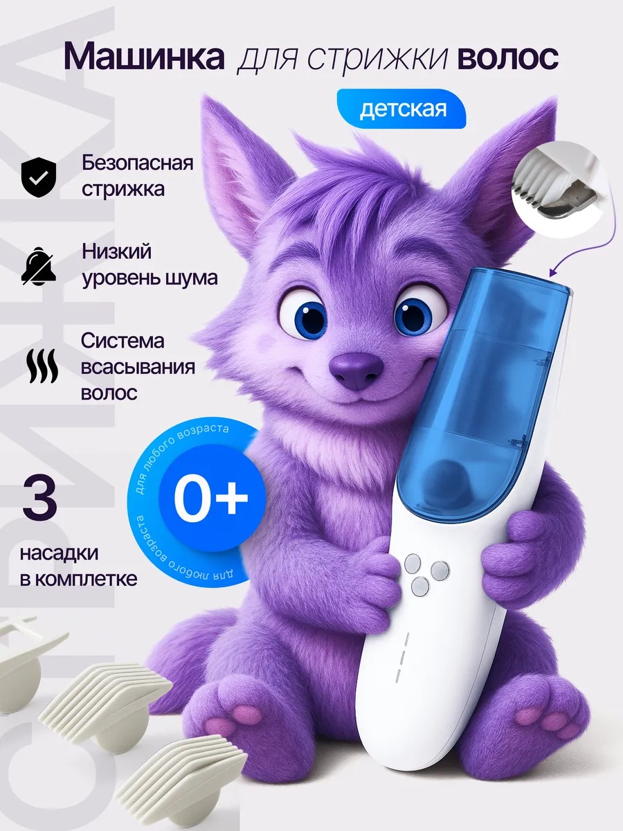 Тихая и безопасная детская машинка для стрижки, оснащённая встроенным вакуумным контейнером — он мгновенно собирает срезанные волосы, не позволяя им разлетаться.