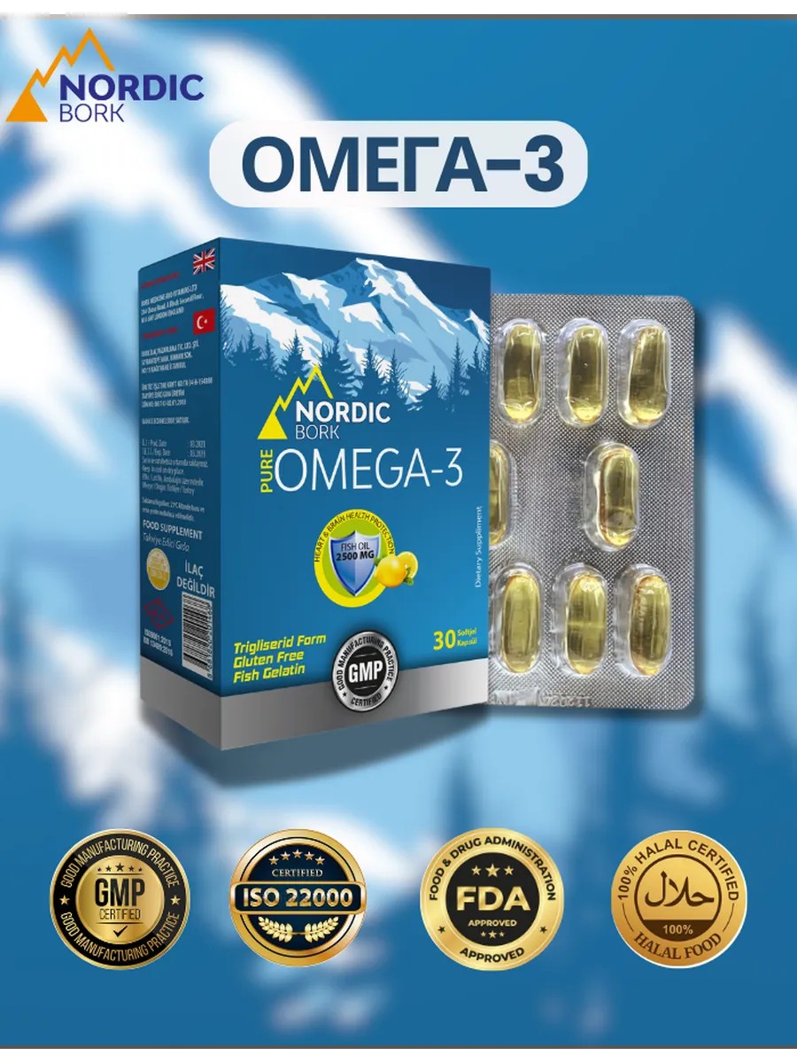Omega-3 производство Турция бренда Nordic - высококачественная пищевая добавка, полученная из мелких диких арктических рыбок, обитающих на атлантическом побережье Норвегии.