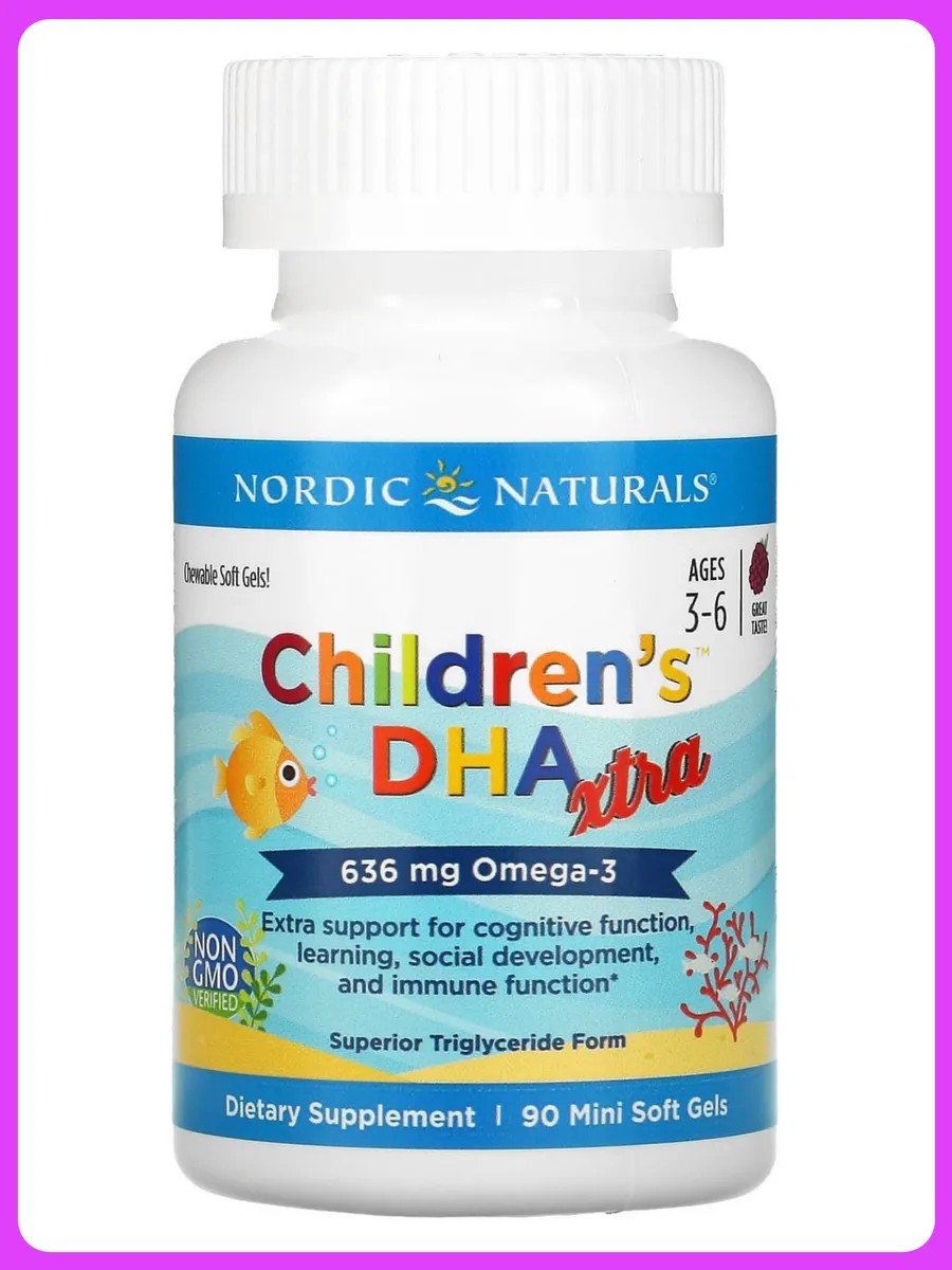 Детство —важнейшее время для развития мозга и нервной системы. Children's DHA Xtra от Nordic Naturals — это новая, более эффективная версия нашей детской омега-3, созданная для детей возрастом от 3 до 6 лет, которым нужна дополнительная поддержка для когнитивных функций, обучения и социального развития. Омега-3 важна для здорового развитие мозга, глаз и нервной системы ребенка. Она является незаменимым помощников в учебе и развитии речи детей, помогает справляться с повышенными умственными нагрузками улучшает внимательность и память. ДКГ помогает укреплять иммунитет, что особенно важно в сезон простуды и гриппа. Рыбий жир препятствует возникновению синдрома сухого глаза из-за долгой работы за компьютером, а также необходим для профилактики снижения остроты зрения, помогает синтезу гормона счастья — серотонина, уменьшает вероятность появления аллергии, способствует быстрому восстановлению после физической активности
