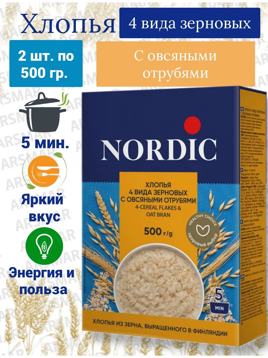 Nordic Овсяные хлопья 4 вида зерновых с овсяными отрубями 2ш по500г