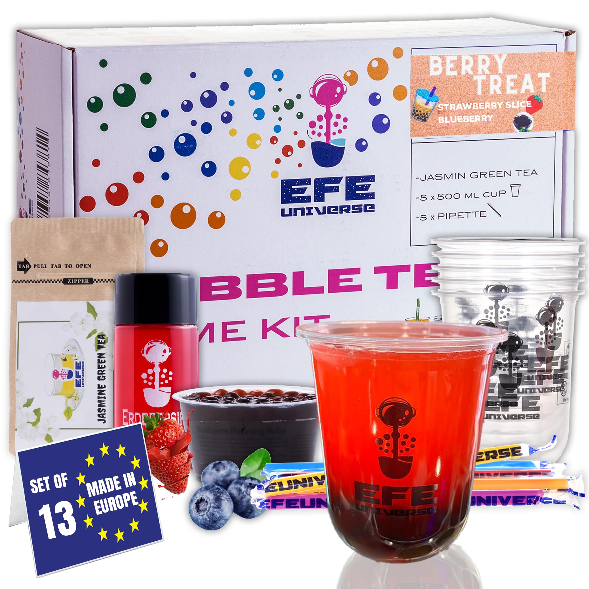 Nordic Schiller Bubble Tea Heimset, berry vibes, made in Europe, 100 vegetarian and gluten-free boba set, blueberry popping boba pearls, strawberry syrup and jasmine-greenUnique gift: an ideal gift for Boba Tee fans.This Nordic Schiller Bubble Tea Home Set contains everything you need to prepare Boba tea at home.Tropical taste: This exciting bubble tea set contains Passion fruit from Boba.Simple application: Simple instructions make it easier to prepare boba tea.Ideal for teenage birthdays, grill parties and more.All-in-one-bubble-tee kit: The pack contains 5 x 500 ml cups, 5 straws, 200 g blueberry popping boba pearls, 200 ml of strawberry syrup and jasmine green tea (5 x 11 g) forThe preparation of 5 portions Boba tea.The manufacturing date is printed on the aroma packs, the expiry date on the extreme pack.100 vegan made in Europe: Experience the delicious enjoyment of the Nordic Schiller Berry Bubble Tea sets - 100 vegan.Get your own bubble tea experience home now.With high -quality ingredients.NORDIC SCHILLER Bubble Tea Heimset, Beere Vibes, Hergestellt in Europa, 100 Vegetarisch und Glutenfrei Boba Set, Blaubeere Popping Boba Perlen, Erdbeer Sirup und Jasmin-GrünteeEINZIGARTIGES GESCHENK: Ein ideales Geschenk für Boba-Tee-Fans. Dieses NORDIC SCHILLER Bubble Tea Home-Set enthält alles, was Sie zum Zubereiten von Boba-Tee zu Hause benötigen. TROPISCHER GESCHMACK: Dieses aufregende Bubble Tea-Set enthält Passionsfrucht von Boba. EINFACHE ANWENDUNG: Einfache Anweisungen erleichtern die Zubereitung von Boba-Tee. Ideal für Teenager-Geburtstage, Grillpartys und mehr. ALL-IN-ONE-BUBBLE-TEE-KIT: Die Packung enthält 5 x 500-ml-Becher, 5 Strohhalme, 200 g Blaubeeere-Popping-Boba-Perlen, 200 ml Erdbeersirup und Jasmin-Grüntee (5 x 11 g) für die Zubereitung von 5 Portionen Boba-Tee. Das Herstellungsdatum ist auf den Aromapackungen aufgedruckt, das Verfallsdatum auf der äußersten Packung. 100 VEGAN HERGESTELLT IN EUROPA: Erleben Sie den köstlichen Genuss des NORDIC SCHILLER Berry Bubble Tea Sets – 100 vegan. Holen Sie sich jetzt Ihr eigenes Bubble Tea-Erlebnis nach Hause. Mit hochwertigen Zutaten.NORDIC SCHILLER Bubble Tea Heimset, Beere Vibes, 100 Vegetarisch und Glutenfrei Boba Set, Blaubeere Popping Boba Perlen, Erdbeer Sirup und Jasmin-Grüntee