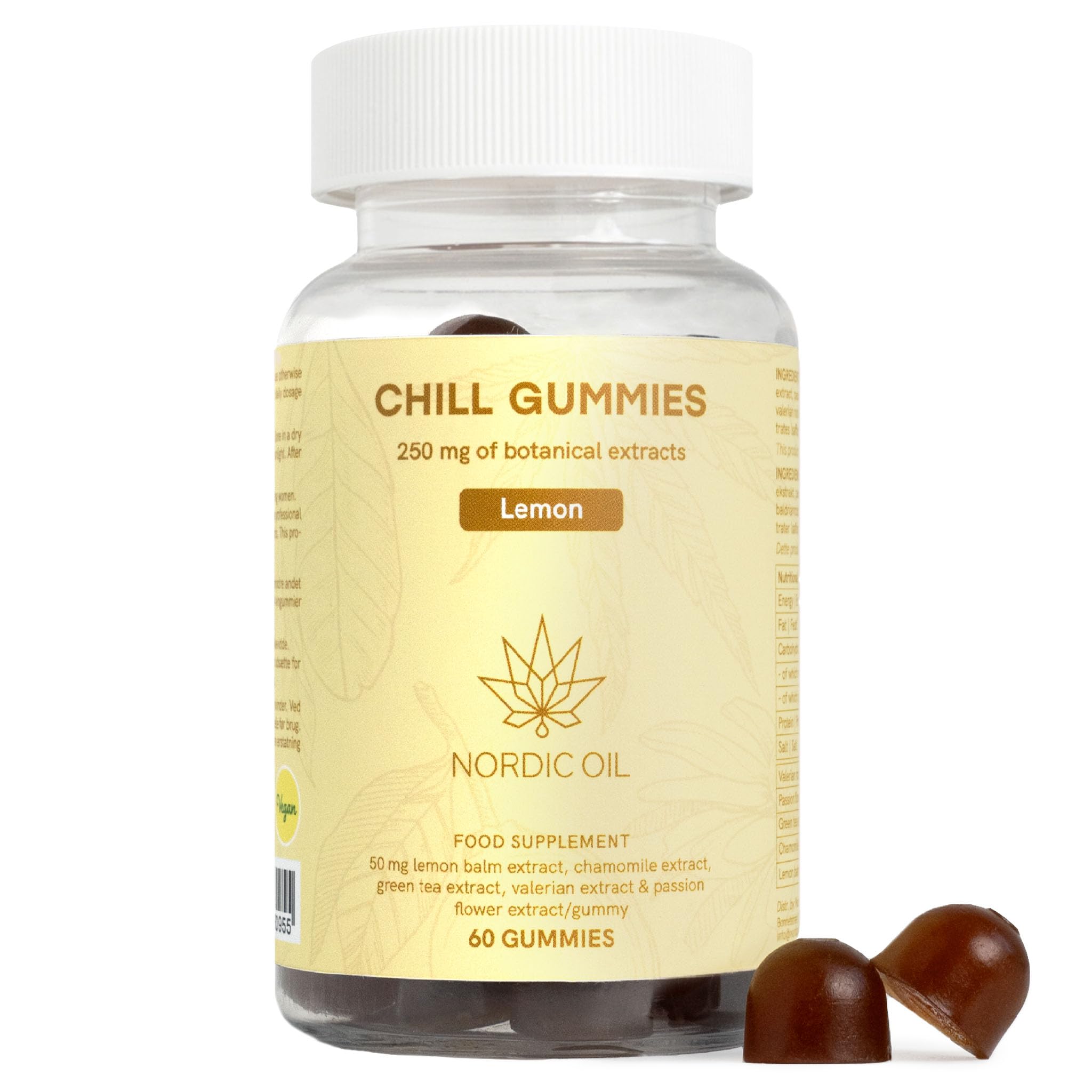 Our Chill Gummies offer a carefully selected blend of plant extracts that help support relaxation, inner peace and mental well-being . Each rubber bear contains 50 mg valerian extract, 50 mg passion flower extract, 50 mg green tea extract, 50 mg chamomile extract and 50 mg lemon balm extract, combined for a pleasant, natural effect. Thanks to the targeted combination of botanical ingredients such as valerian, passion flower, chamomile, lemon balm and green tea extract, our gummies promote gentle support in stressful situations, help with relaxation and can strengthen mental well-being. They are ideal for the daily break, for evening relaxation or as a gentle accompaniment before going to sleep. Vegan, gluten-free and sugar-free, with a refreshing lemon flavor, the gummies are easy to swallow. The included plant extracts provide natural support for calming, stress reduction, relaxation and mental balance. INGREDIENTS maltitol syrup, maltitol, water, citric acid, pectin, green tea extract, passion flower extract, melissa extract, chamomile extract, valerian root extract, potassium sodium tartrate, natural flavors, concentrates (safflower, lemon), natural flavors, carnauba wax LEGAL DISCLAIMER Recommended dosage: Chew 1-4 rubbers daily, unless your doctor recommends otherwise. The maximum daily dose of 4 rubbers should not be exceeded. Note: Not suitable for children, pregnant and lactating women. If you are ill or taking medication, consult your doctor before use. Excessive use may have a laxative effect. This product is not a substitute for a healthy and balanced diet. See moreVegan, gluten-free and sugar-free: free from artificial flavors, colorings and preservatives, ideal for a conscious diet and a healthy lifestyle. Better than others: the unique plant mix provides noticeable relaxation, without ashwagandha and without the side effects that many want to avoid. Calmness, stress and sleep: the extracts of valerian, passion flower, chamomile, balm and green tea gently support inner peace and promote a good night's sleep. 60 gummies – delicious lemon flavor – enjoy 2 gummies daily with a refreshing lemon flavor and a balanced portion of plant extracts for your daily relaxation. Plant-based relaxation formula: Each gummy contains 50 mg of valerian, passionflower, green tea, chamomile and balm extract, carefully combined to gently support stress and promote inner peace. Effective alternative to ashwagandha: supports stress reduction and relaxation naturally, without the typical side effects or insecurities that some fear.No Stress Gummies 60 veganistische gummies 250 mg plantaardige extracten per gom valeriaan, passiebloem, groene thee, kamille, melissa stress ontspanning Nordic Oil Onze Chill Gummies bieden een zorgvuldig geselecteerde mix van plantaardige extracten die bijdragen aan de ondersteuning van ontspanning, innerlijke rust en geestelijk welzijn . Elke rubberen beer bevat 50 mg valeriaanextract, 50 mg passiebloemenextract, 50 mg groene thee-extract, 50 mg kamille-extract en 50 mg citroenmelisse-extract, gecombineerd voor een aangenaam, natuurlijk effect. Dankzij de gerichte combinatie van plantaardige ingrediënten zoals valeriaan, passiebloem, kamille, citroenmelisse en groene thee-extract bevorderen onze gummies een zachte ondersteuning in stresssituaties, helpen bij het ontspannen en kunnen ze het mentale welzijn versterken. Ze zijn ideaal voor de dagelijkse pauze, voor avondontspanning of als zachte begeleiding voor het slapengaan. Veganistisch, glutenvrij en suikervrij, met een verfrissende citroensmaak, kunnen de gummies gemakkelijk worden ingenomen. De meegeleverde plantenextracten bieden natuurlijke ondersteuning voor kalmering, stressvermindering, ontspanning en mentale balans. INGREDIËNTEN maltitolsiroop, maltitol, water, citroenzuur, pectine, groene thee-extract, passiebloemenextract, melissa-extract, kamille-extract, valeriaanwortel-extract, kaliumnatriumtartraat, natuurlijke aroma's, concentraten (saffloer, citroen), natuurlijke aroma's, carnaubawas WETTELIJKE DISCLAIMER Aanbevolen dosering: kauwen dagelijks 1-4 rubbers, tenzij uw arts anders aanbeveelt. De maximale dagelijkse dosis van 4 rubbers mag niet worden overschreden. Opmerking: niet geschikt voor kinderen, zwangere vrouwen en vrouwen die borstvoeding geven. Bij ziekte of het innemen van medicijnen, raadpleeg je arts voor gebruik. Overmatig gebruik kan een laxerend effect hebben. Dit product is geen vervanging voor een gezonde en evenwichtige voeding. Meer bekijkenVeganistisch, glutenvrij en suikervrij: vrij van kunstmatige aroma's, kleurstoffen en conserveringsmiddelen, ideaal voor een bewuste voeding en een gezonde levensstijl. Beter dan anderen: de unieke plantenmix zorgt voor merkbare ontspanning, zonder ashwagandha en zonder de bijwerkingen die velen willen vermijden. Kalmering, stress en slaap: de extracten van valeriaan, passiebloem, kamille, melisse en groene thee ondersteunen zacht de innerlijke rust en bevorderen een goede nachtrust en bevorderen een goede nachtrust. 60 gummies – lekkere citronensmaak – geniet dagelijks van 2 gummies met verfrissende citroensmaak en een evenwichtige portie plantaardige extracten voor je dagelijkse ontspanning. Plantaardige ontspanningsformule: elke gummy bevat 50 mg valeriaan, passiebloemen, groene thee, kamille en melisse-extract, zorgvuldig gecombineerd voor zachte ondersteuning bij stress en bevordering van innerlijke rust. Effectief alternatief voor ashwagandha: ondersteunt stressvermindering en ontspanning op natuurlijke wijze, zonder de typische bijwerkingen of onzekerheden waar sommigen bang voor zijn.