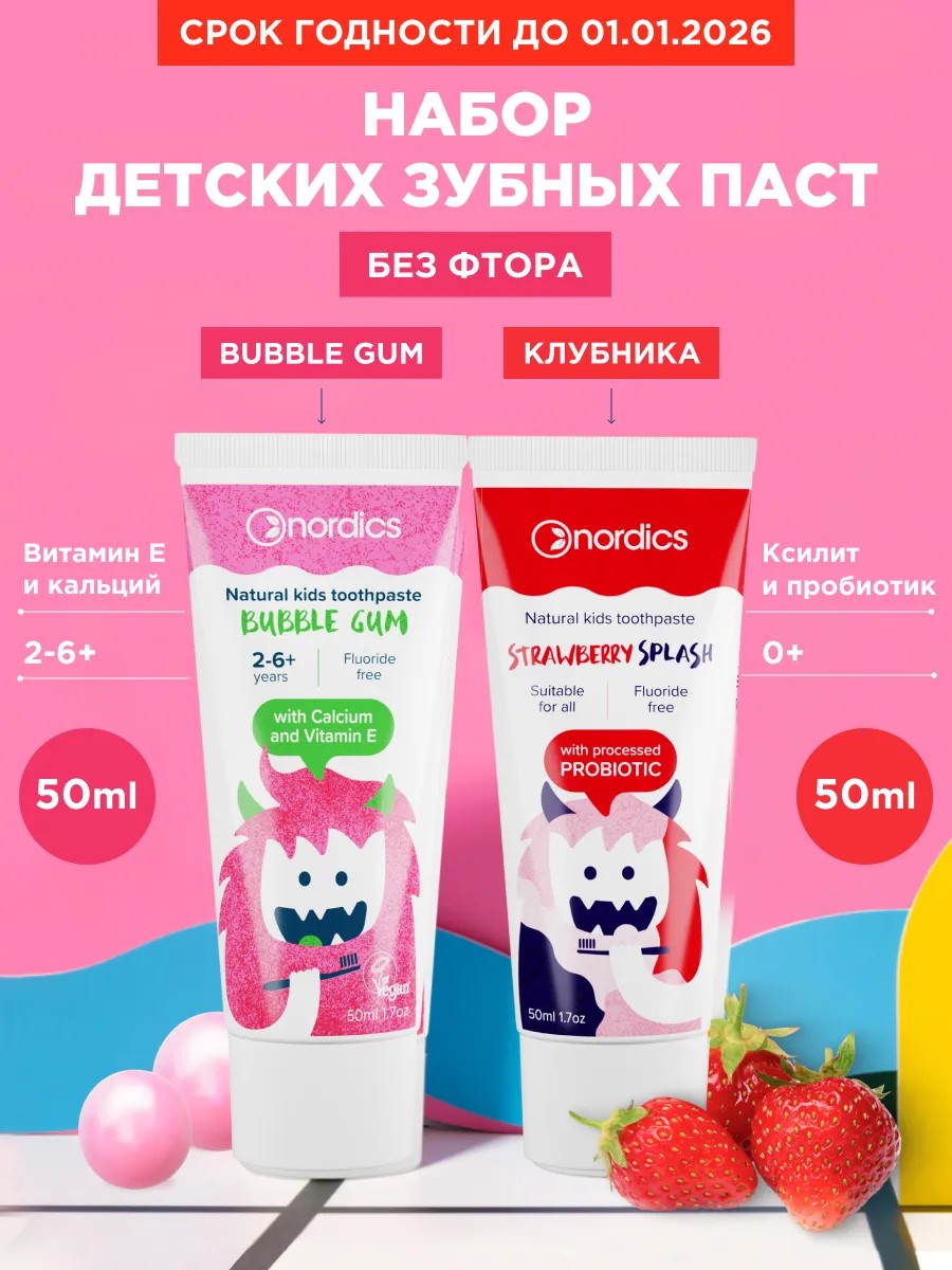 Зубная паста детская 50 мл в наборе 2шт из натуральных компонентов идеальная для чувствительных зубов и десен. Она органически очищает от налета и камня, освежает дыхание и защищает десны от повреждений и кровоточивости. Маленький профессиональный продукт не содержит фтор и имеет приятный мятный вкус. Дорожный тюбик подойдет для ежедневного использования, защищая от кариеса и имея лечебные свойства от пародонтоза. Гель позволяет реминерализировать эмаль и хорошо поддержать микрофлору во рту. Паста в гелевой текстуре бережно отбеливает поверхность зубов, подходит для детей от 0-3 лет, а также имеет приятный аромат жвачки баббл гам и клубника.