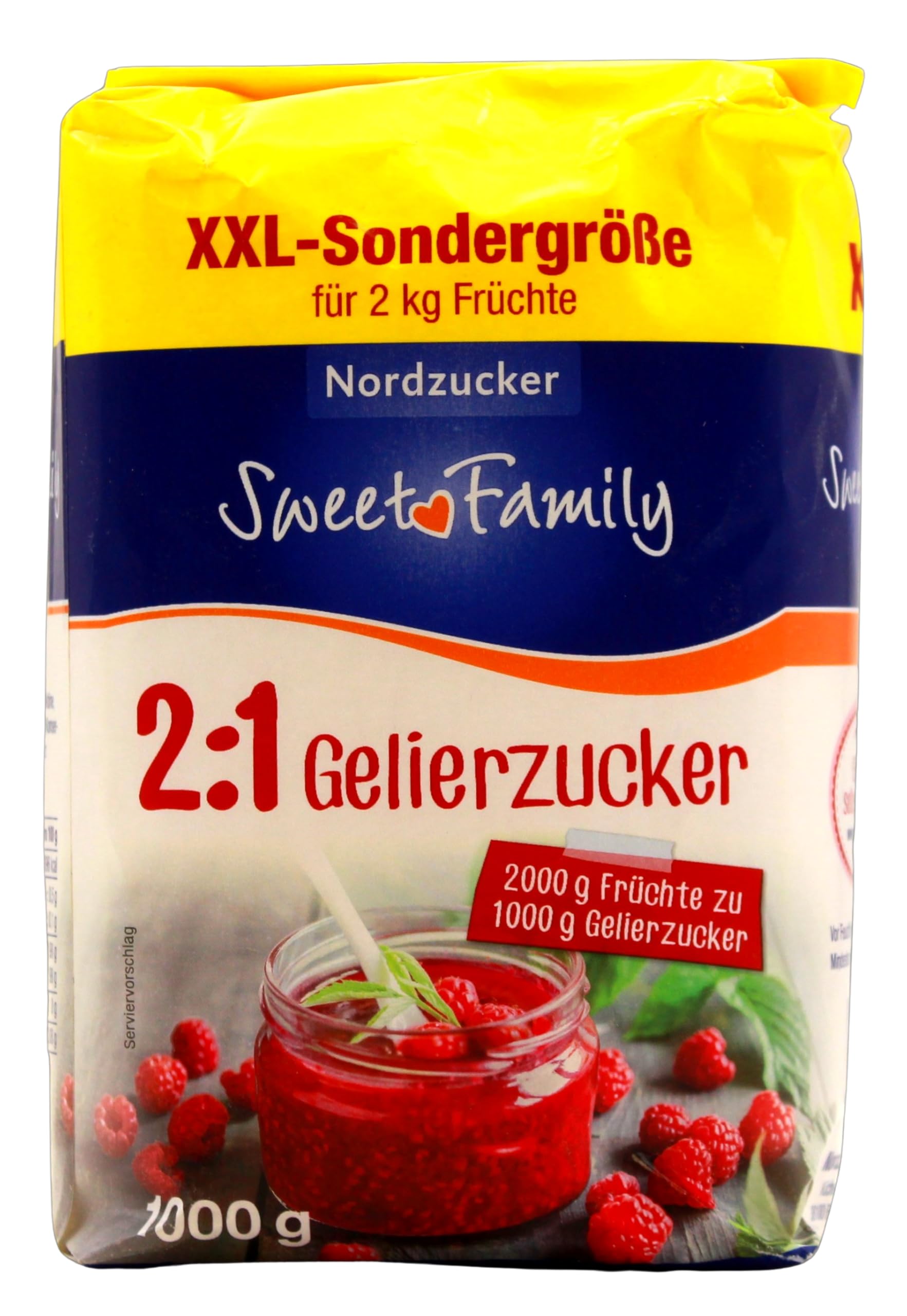 jelly sugar INGREDIENTS sugar, gelling agent: pectins, acidity regulator: citric acid, preservative: potassium sorbate, vegetable oil (fully hydrogenated sunflower oil). INSTRUCTIONS FOR USE 1. Bladder: wash, destem and deseed fruit, weigh 2 kg, cut into small pieces or puree. Then mix with 1 kg of jelly sugar 2:1. Jell: Mix 1.5 l cold, unsweetened fruit juice with 1 kg jelly sugar 2:1. 2nd Bring the mass to the boil in a sufficiently large pan while stirring (avoid boiling over). Then continue to cook until bubbly for 4 minutes, stirring constantly. Run a sample. 3. Immediately fill prepared jars to the brim and close. See moreNordzucker Sweet Family Geliersuiker 2:1, verpakking van 10 stuks (10 x 1 kg) geleisuiker INGREDIËNTEN suiker, geleermiddel: pectines, zuurteregel: citroenzuur, conserveringsmiddel: kaliumsorbaat, plantaardige olie (volledig geharde zonnebloemolie). GEBRUIKSAANWIJZING 1. Blaas: fruit wassen, ontsteelen en ontpitten, 2 kg wegen, klein snijden of pureeren. Meng vervolgens met 1 kg geleisuiker 2:1. Jell: meng 1,5 l koud, ongezoet vruchtensap met 1 kg geleisuiker 2:1. 2de Breng de massa in een voldoende grote pan onder roeren aan de kook (overkoken vermijden). Blijf dan 4 minuten onder voortdurend roeren bruisend koken. Voer een monster uit. 3. Onmiddellijk tot de rand vol in voorbereide potten vullen en sluiten. Meer bekijken