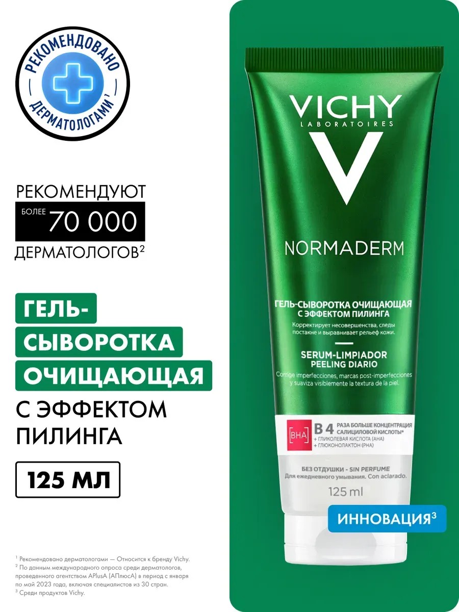 Normaderm представляет новый гель-сыворотку с эффектом пиллинга, предназначенный для ежедневной борьбы с высыпаниями и пост-акне. Ежедневное очищающее средство, с концентрацией активных веществ, как у сыворотки, для устранения следов постакне, начиная с этапа 1: очищения. Гель-сыворотка обладает легкой пенящейся текстурой, корректирует несовершенства и следы постакне. Активные ингредиенты: Салициловая кислота – компонент, относящийся к классу BHA (бетагидроксикислот). BHA-кислоты действуют на поверхности кожи и глубоко внутри пор благодаря своей жирорастворимой структуре. Они проникают в поры, очищают их и устраняют черные точки, предотвращая появление новых высыпаний. Гликолевая кислота отшелушивает кожу на поверхности и ускоряет обновление кожи, эффективно сокращая пятна и следы от несовершенств кожи. Глюконолактон – полигидроксикислота (PHA), которая является более мягкой альтернативой альфа-гидроксикислотам (AHA) и бета-гидроксикислотам (BHA). Обеспечивает постепенное, но эффективное отшелушивание. Способ применения: наносить утром или вечером на влажную кожу массажными движениями и смыть водой. Подходит для кожи лица, области груди, спины и плеч. Избегайте области вокруг глаз. В случае попадания в глаза немедленно промойте водой. Эффективность: через 1 месяц использования* -57% Следы постакне сокращены. -51% Несовершенств кожи. -47% Жирности кожи. -64% Черных точек и комедонов. *Клиническое исследование, 52 участника. Вы также можете найти данное средство по запросам: гель для умывания кожи лица и тела с кислотами; сыворотка для лица; серум; serum; химический пилинг; умывалка против акне, прыщей, черных точек и комедонов; умывашка от рубцов, постакне и пятен после угревой сыпи; женская и мужская французская косметика; аптечная уходовая косметика для подростков и взрослых; эксфолиант; для жирной, проблемной и комбинированной кожи; себорегулирующий и очищающий уход для кожи лица и тела; отшелушивающий пилинг.