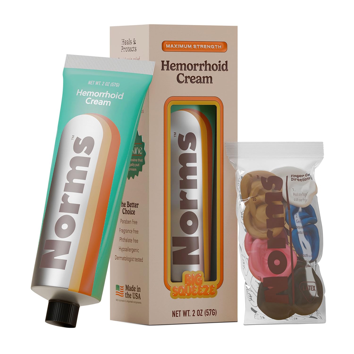 Clean, effective formula: Dermatologist formulated and hypoallergenic with no parabens, phthalates, or fragrance. Gentle on sensitive skin but strong enough for tough symptoms. Proudly made in the USA. More for less: The Big Squeeze tube delivers 2oz of relief—twice as much cream as other brands. Looking for more support, take a look at the Norms Full Treatment bundle that includes our spray, lidocaine cream, and wipes to tackle your flare up with full force. Soothes and protects: Aloe and glycerin create a moisturizing barrier that locks in hydration, calms irritation, and supports healing. Long lasting effects you can't get from other sprays or pads. Reduces swelling and pressure: Phenylephrine HCL shrinks inflamed tissue by constricting blood vessels, eg hemorrhoid discomfort quickly. Maximum strength hemorrhoid relief: 5 lidocaine numbs pain fast and is the highest potency you can get without a prescription. Targeted formula calms flare-ups quickly so you can get back to normal. Includes 24 multi-color finger cots for hygienic application. HSA FSA Eligible.