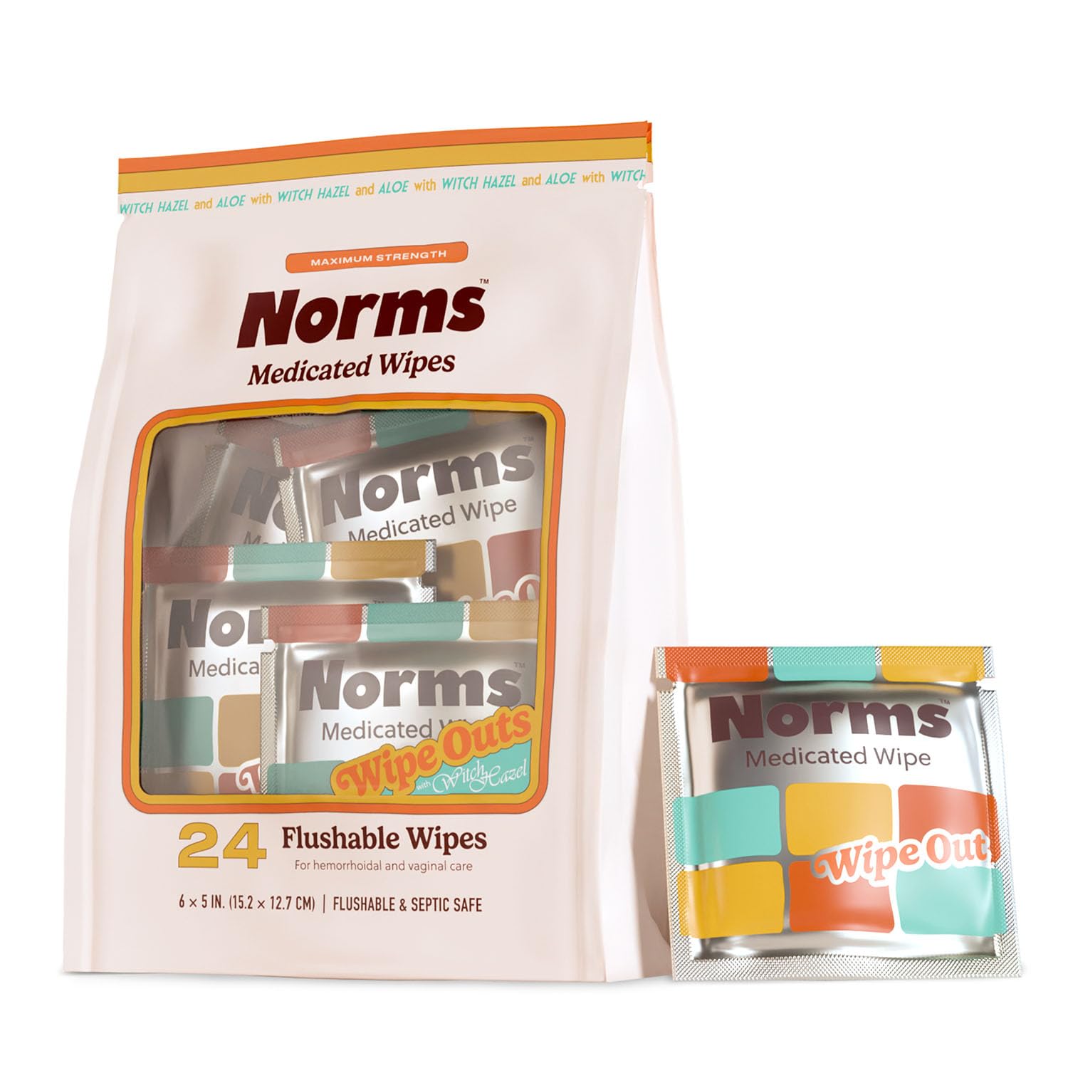 Norms Wipe Outs Hemorrhoid Wipes 24 Individually Wrapped Witch Hazel Wipes with Aloe to Soothe and Cool Itching Burning and Irritation Flushable Septic Safe Plant Based & Plastic-Free