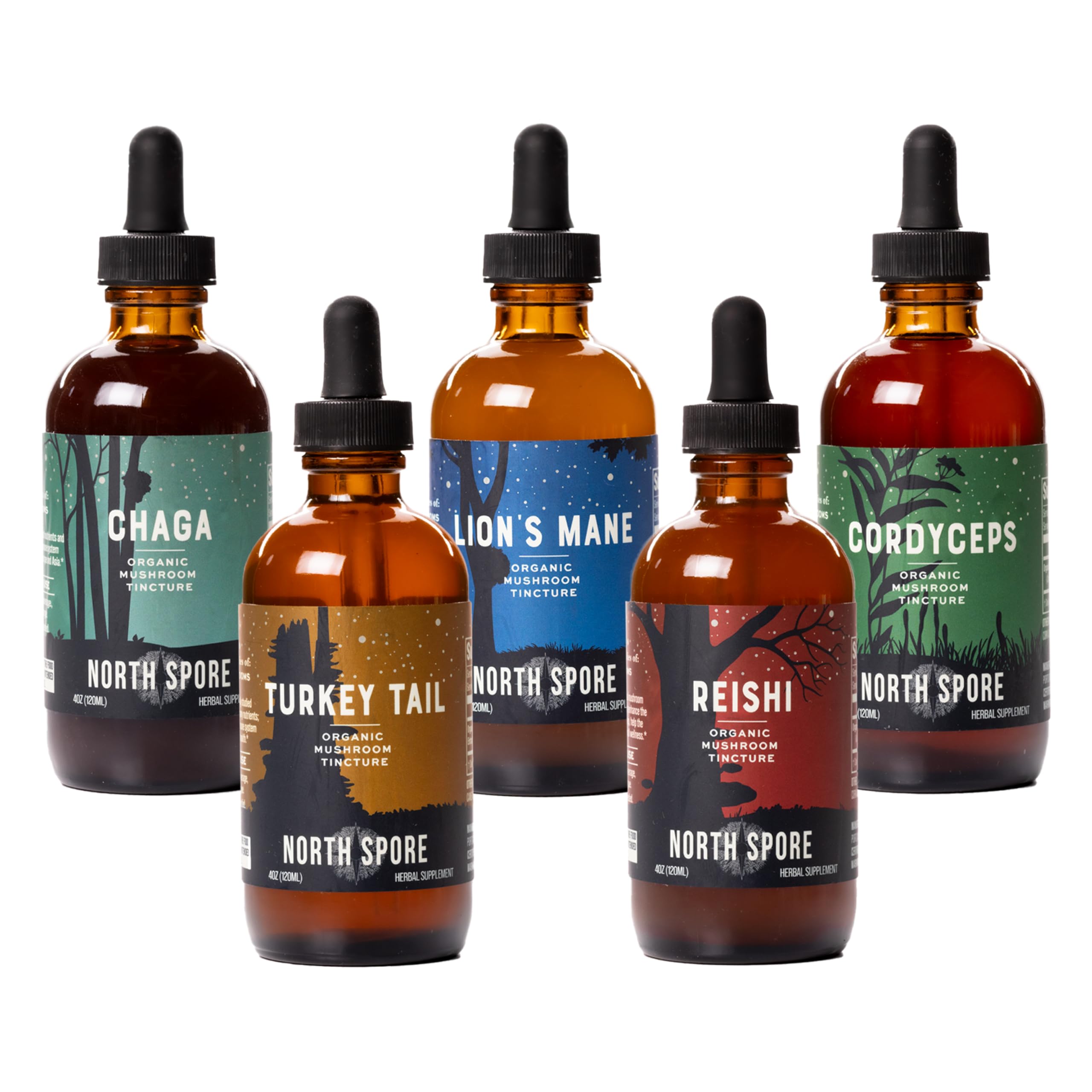 These statements have not been evaluated by the Food and Drug Administration. This product is not intended to diagnose, treat, cure, or prevent any disease. RECOMMENDED USE: Add 1-3 full droppers to a beverage, or place directly on your tongue. Use 1-3 times daily or as needed. CORDYCEPS TINCTURE (4 oz): Often referred to as the "Olympic mushroom," cordyceps (Cordyceps militaris) has traditionally been used to help sustain energy and boost vitality. In recent studies, it has been shown to enhance physical performance and athletic recovery due to the presence of adenosine and cordycepin. REISHI TINCTURE (4 oz): Also known as "Song Shan Ling Zhi," Reishi (Ganoderma tsugae) is highly esteemed due to its wide variety of uses. It has traditionally been used to support daily stress, lessen fatigue, and balance immune system function. CHAGA TINCTURE (4 oz): Chaga (Inonotus obliquus) is rich in vitamins, minerals, and antioxidants. It is considered a super-food, packed with antioxidants that help boost immunity, stimulate the production of natural energy, and support overall health. TURKEY TAIL TINCTURE (4 oz): Turkey tail (Trametes versicolor) is widely used to enhance immune function while helping to boost the body's natural defenses. Rich in antioxidants, this prebiotic has also been studied for its ability to support healthy digestion and promote a balanced gut microbiome. LION'S MANE TINCTURE (4 oz): Known as the "smart mushroom," lion's mane (Hericium erinaceus) has traditionally been used to promote memory, focus, and mental clarity while supporting nervous system function. SERVINGS: Up to 120 servings per 4 oz bottle. THIRD-PARTY TESTED: All North Spore supplements are manufactured in Good Manufacturing Practice (GMP) facilities under strict quality control and safety standards. The finished extracts are third-party tested for purity and medicinal compound content before bottling. PURITY POTENCY: Organic, vegan, non-GMO, and gluten-free, North Spore's tinctures are crafted from concentrated organic mushroom extracts made from 100 fruiting bodies and sclerotia. Our double extraction method ensures that our tinctures pack exponentially more of the active compounds found in each species.