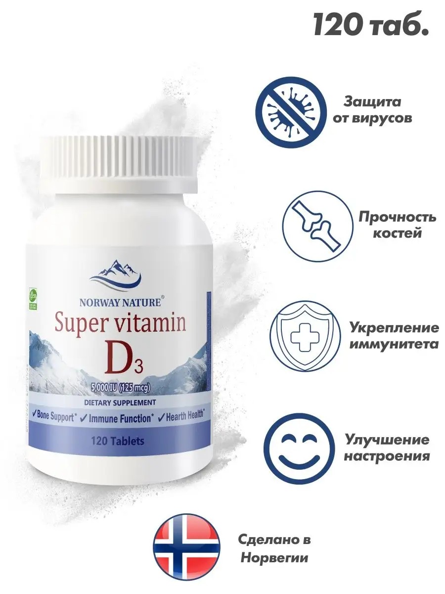 Norway Nature Super Vitamin D3 5000 IU - D3 is a vitamin that affects the anabolic activity of the body. A positive balance of macronutrients promotes the production of natural growth hormone, which ensures both muscle mass gain and recovery after exercise. Vitamin D3 can be produced by the body under the influence of ultraviolet rays, but during stressful or strength training, it is recommended to increase the concentration of the vitamin by taking sports supplements. A distinctive feature of the complex is the high concentration of the vitamin, presented in a purified formula, which ensures easy absorption. Regular use of vitamin D3 will provide: Stabilization of metabolism and digestion; Acceleration of muscle fiber synthesis; Increased endurance and stress resistance; Improved well-being and prevention of fatigue. Ingredients: microcrystalline cellulose, dicalcium phosphate, magnesium stearate. 1 tablet contains: Vitamin D3 (as cholecalciferol) 125 mcg. Directions: 1 tablet daily with meals.