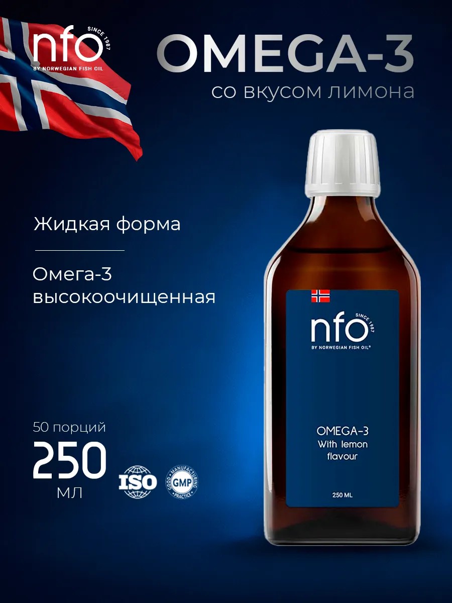NFO Жидкая Омега 3 со вкусом лимона и витамином Е — натуральный высокоочищенный рыбий жир из Норвегии в жидкой форме.