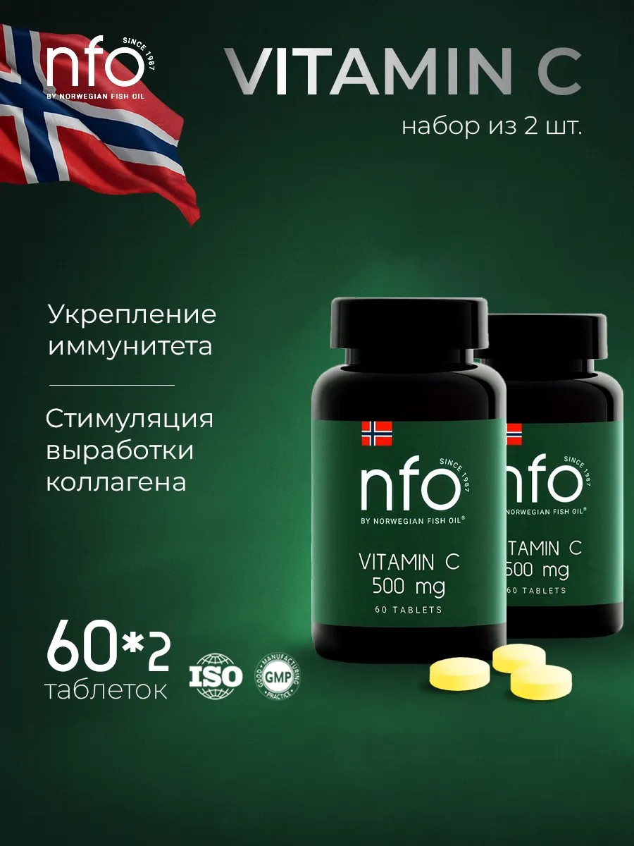 Norwegian Fish Oil NFO Витамин С + Кверцетин 500мг, 2банки по 60 таблеток