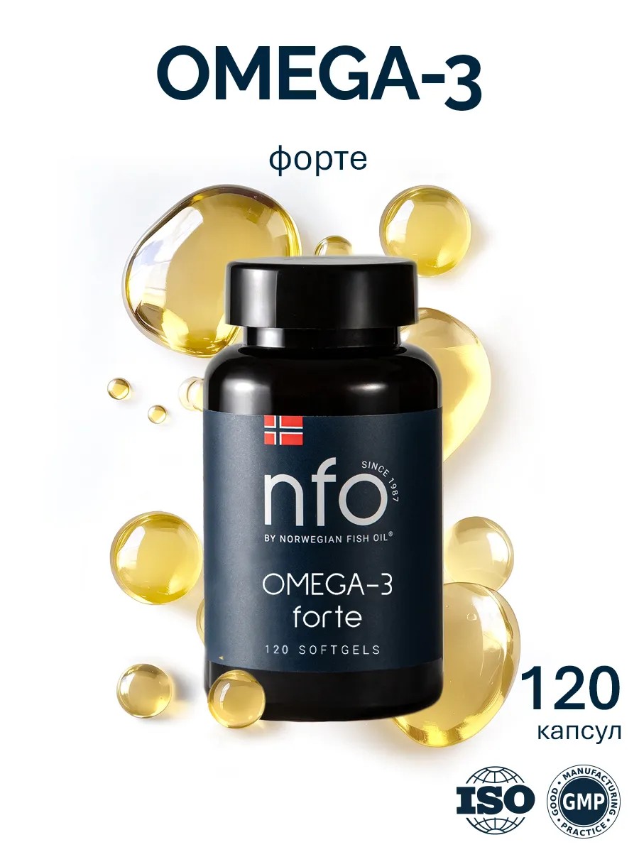 NFO Омега 3 Форте с витамином Е – натуральный высокоочищенный рыбий жир в желатиновых капсулах для взрослых и детей с 3-х лет с высокой концентрацией омега 3 жирных кислот в одной капсуле.