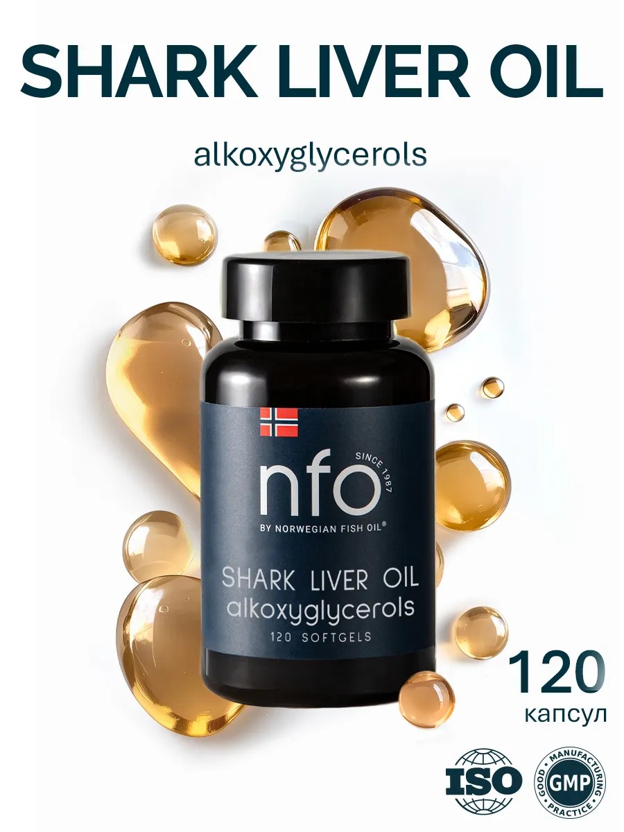 NFO Жир печени акулы – уникальный комплекс из высокоочищенного жира печени акулы с алкоксиглицеридами, скваленом и дополнительным содержанием омега 3 в капсулах. Содержит витамины А, Д, Е для укрепления иммунитета и усиления противоопухолевой защиты.