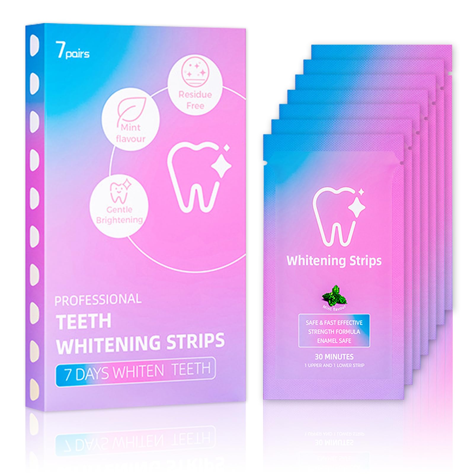 EASY TO USE: Whether you're relaxing at home or preparing for a special event, our whitener strips for teeth whitening offer effortless usage anytime and Teeth Whitening Strips are perfect for preparing important dates, parties, weddings, or everyday use. EXPERIENCE A MINTY REFRESHING TASTE: Gentle ingredients of the tooth whitening strips that is comfortable and non-irritating on the mouth. Whiten your teeth while eliminating oral odors. Enjoy a comfortable and refreshing whitening process that leaves your oral care feeling fresh and clean. EFFECTIVE AGAINST VARIOUS STAINS: Extensive clinical trials have shown that the natural materials of whitening strips for teeth non-sensitive can address a wide range of stains, including those caused by coffee, tea, wine, tobacco, and food, along with stubborn tooth stains accumulated over the years. Use for 3 weeks to achieve a brighter smile. GRIP-ENHANCING AND NO REMNANTS TECHNOLOGY: The white strips for teeth whitening are covered with small suction pads that firmly adhere to your teeth without slipping. Additionally, the no remnants gel technology ensures that no adhesive film is left on your teeth after taking off the strips, making them easy to clean. WHITENING STRIPS FOR SENSITIVE TEETH: These teeth whitening strips are made from enamel-safe ingredients that used by dentists. They can quickly and thoroughly dissolve tooth discolorations and remove stains without sensitivity.