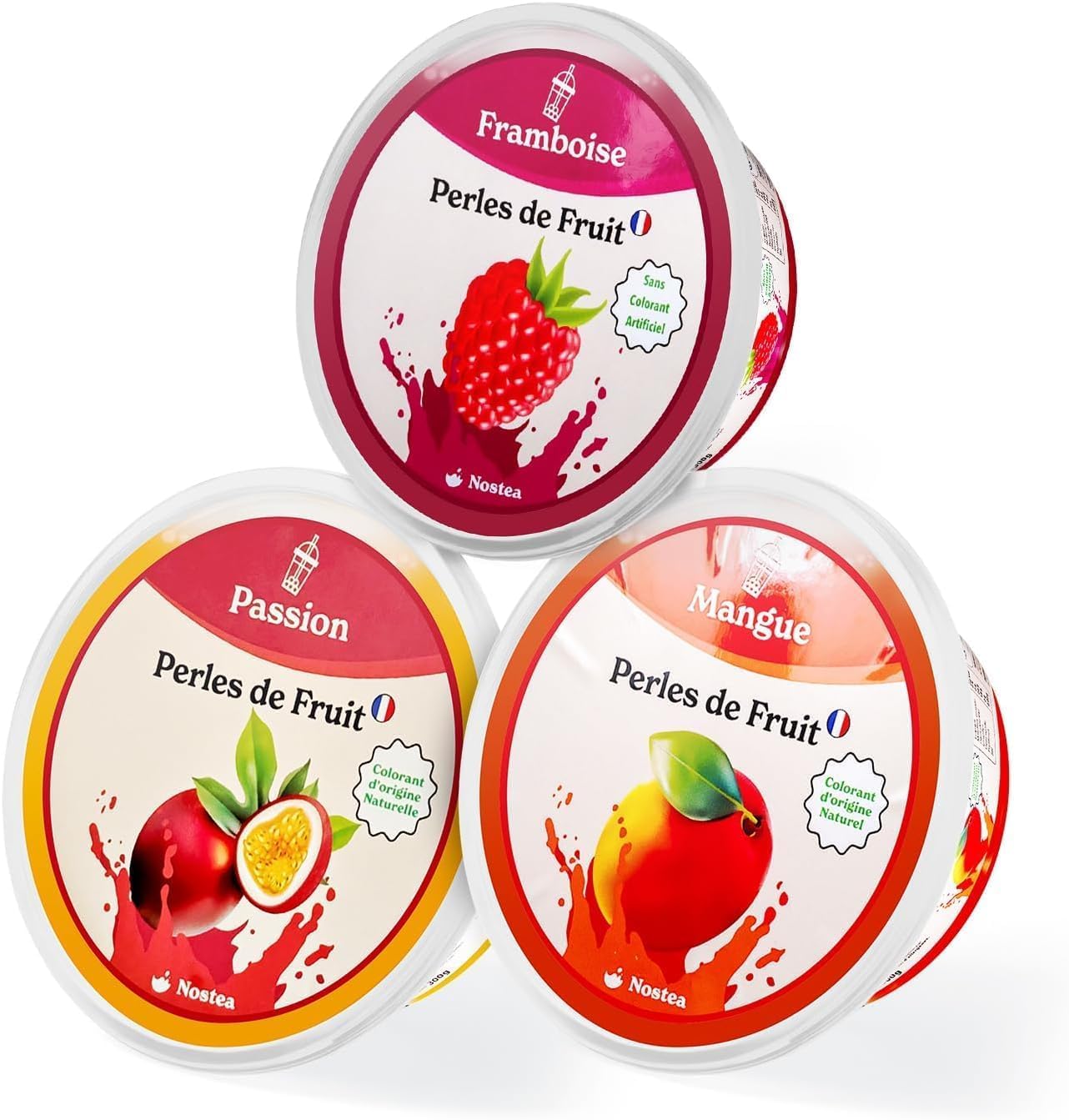 Safety Information Choking hazard: not suitable for children under 4 years. If used by older children, supervision is required. Ingredients Water, glucose, passion fruit syrup 2.8 (fruit juice from concentrate 38 : passion fruit 21 , lemon 17 , colors: E160a, E160c, fructose) flavorings acid: lactic acid gelling agents 1.9 : sodium alginate, calcium lactate, calcium chloride thickeners: xanthan gum, guar gum preservative: potassium sorbate color E133 Water, glucose, peach syrup 2.8 (fruit juice from concentrate 53 : peach 37.5 , lemon 15.5 , elderberry juice concentrate for coloring, lutein E161b, stabilizer: E445, fructose) flavorings acids: lactic acid, citric acid gelling agents 1.9 : sodium alginate, calcium lactate, calcium chloride thickeners: xanthan gum, guar gum preservative: potassium sorbate color E100 Water, glucose, peach syrup 2.8 (fruit juice from concentrate 53 : peach 37.5 , lemon 15.5 , elderberry juice concentrate for coloring, lutein E161b, stabilizer: E445, fructose) flavorings acids: lactic acid, citric acid Gelling agents 1.9 : sodium alginate, calcium lactate, calcium chloride thickeners: xanthan gum, guar gum preservative: potassium sorbate color E100 Water, glucose, strawberry syrup 2.8 (fruit juice from concentrate 15 : strawberry 10 , blackcurrant 5 , fructose) flavorings acids: lactic acid, citric acid gelling agents 1.9 : sodium alginate, calcium lactate, calcium chloride thickeners: xanthan gum, guar gum preservative: potassium sorbate sweet potato extract, purple carrot extract for coloring. Storage instructions: Before opening, store at room temperature for up to 18 months. After opening, keep refrigerated between 2 C and 5 C for 14 days.Nostea - Lot de 3 Pots, Perles Bubble Tea - Popping Boba, Sans Gluten - Perles au Jus de Fruit pour pour Thé, Boissons - Fabrication Française - 3x 450 gr (Mangue, Passion, Framboise)DESCRIPTION DU PRODUIT Informations de sécurité Risque d'étouffement : ne convient pas aux enfants de - de 4 ans. En cas d'utilisation par des enfants plus âgés,une surveillance s'impose. Ingrédients Eau, glucose, sirop de fruit de la passion 2,8 (jus de fruit à base de concentré 38 :passion 21 , citron 17 , colorants: E160a, E160c, fructose) arômes acidifiant: acide lactique gélifiants 1,9 : alginate de sodium, lactate de calcium, chlorure de calcium épaississants: gomme xanthane, gomme guar conservateur: sorbate de potassium colorant E133 Eau, glucose, sirop de pêche 2,8 ( jus de fruits à base de concentré 53 : pêche 37,5 , citron 15,5 , jus concentré de sureau pour colorer, lutéine E161b, stabilisant: E445, fructose ) arômes acidifiants: acide lactique, acide citrique gélifiants 1,9 : alginate de sodium, lactate de calcium, chlorure de calcium épaississants: gomme xanthane, gomme guar conservateur: sorbate de potassium colorant E100 Eau, glucose, sirop de pêche 2,8 ( jus de fruits à base de concentré 53 : pêche 37,5 , citron 15,5 , jus concentré de sureau pour colorer, lutéine E161b, stabilisant: E445, fructose ) arômes acidifiants: acide lactique, acide citrique gélifiants 1,9 : alginate de sodium, lactate de calcium, chlorure de calcium épaississants: gomme xanthane, gomme guar conservateur: sorbate de potassium colorant E100 Eau, glucose, sirop de fraise 2,8, (jus de fruits à base de concentré 15 : fraise 10 , cassis 5 , fructose) arômes acidifiants : acide lactique, acide citrique gélifiants 1,9 : alginate de sodium, lactate de calcium, chlorure de calcium épaississants: gomme xanthane, gomme guar conservateur: sorbate de potassium extrait de patate douce, extrait de carotte pourpre pour colorer. Conseils d'utilisation Avant ouverture à température ambiante jusqu'à 18 mois. Après ouverture conserver au réfrigérateur 2 et 5 C 14 jours .