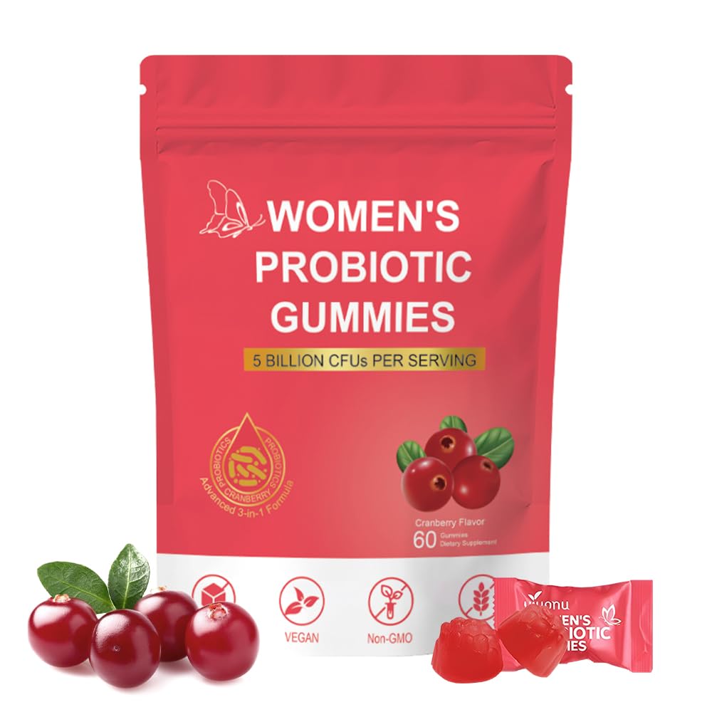 Simple Everyday Health: Each pouch contains 60 premium gummies. Simply take two a day, anytime, with or without food – an effortless addition to your self-care routine. Powerful Digestive Support: With 5 billion CFUs per dose, these probiotics help relieve symptoms of bloating, flatulence and constipation, while supporting normal digestion and balanced intestinal flora. Dual Probiotics and Prebiotics Support: These probiotic gummies are specially formulated to balance the vaginal microbiome, support yeast, and maintain a healthy vaginal environment with each intake. Vaginal health in a tasty way: We've combined the benefits of traditional female probiotics into a tasty and convenient gummy that helps support a healthy vaginal environment, immunity and pH balance. Supporting Feminine Balance: Our probiotic gummies for women are expertly formulated to support women's overall well-being. They contain a powerful blend of probiotics with 5 billion CFU (colony forming units) consisting of Lactobacillus acidophilus, Bifidobacterium lactis and Bacillus coagulans, to support the health of the digestive system and vaginal microbiome.Probiotische gummies voor dames, Premium vrouwelijke PH Balance Gummy, 5 miljard CFU's, Cranberry-smaak, suikervrij, veganistisch, 60 stuksEenvoudige dagelijkse gezondheid: Elk zakje bevat 60 premium gummies. Neem er gewoon twee per dag, op elk moment, met of zonder voedsel - een moeiteloze aanvulling op je zelfzorgroutine. Krachtige spijsverterings-ondersteuning: met 5 miljard CFU's per dosis helpen deze probiotica de symptomen van een opgeblazen gevoel, winderigheid en constipatie te verlichten, terwijl ze de normale spijsvertering en een evenwichtige darmflora ondersteunen. Dubbele probiotica- en prebiotica-ondersteuning: deze probiotische gummies zijn speciaal samengesteld om het vaginale microbioom in balans te brengen, de gisten te ondersteunen en bij elke inname een gezonde vaginale omgeving te behouden. Vaginale gezondheid op een lekkere manier: we hebben de voordelen van traditionele vrouwelijke probiotica gecombineerd in een smakelijke en handige gummy die helpt een gezonde vaginale omgeving, de afweer en de pH-balans te ondersteunen. Ondersteuning van de vrouwelijke balans: onze probiotica-gummies voor vrouwen zijn deskundig samengesteld om het algemeen welzijn van vrouwen te ondersteunen. Ze bevatten een krachtige mix van probiotica met 5 miljard CFU (colony forming units) bestaande uit Lactobacillus acidophilus, Bifidobacterium lactis en Bacillus coagulans, ter ondersteuning van de gezondheid van het spijsverteringsstelsel en het vaginale microbioom.