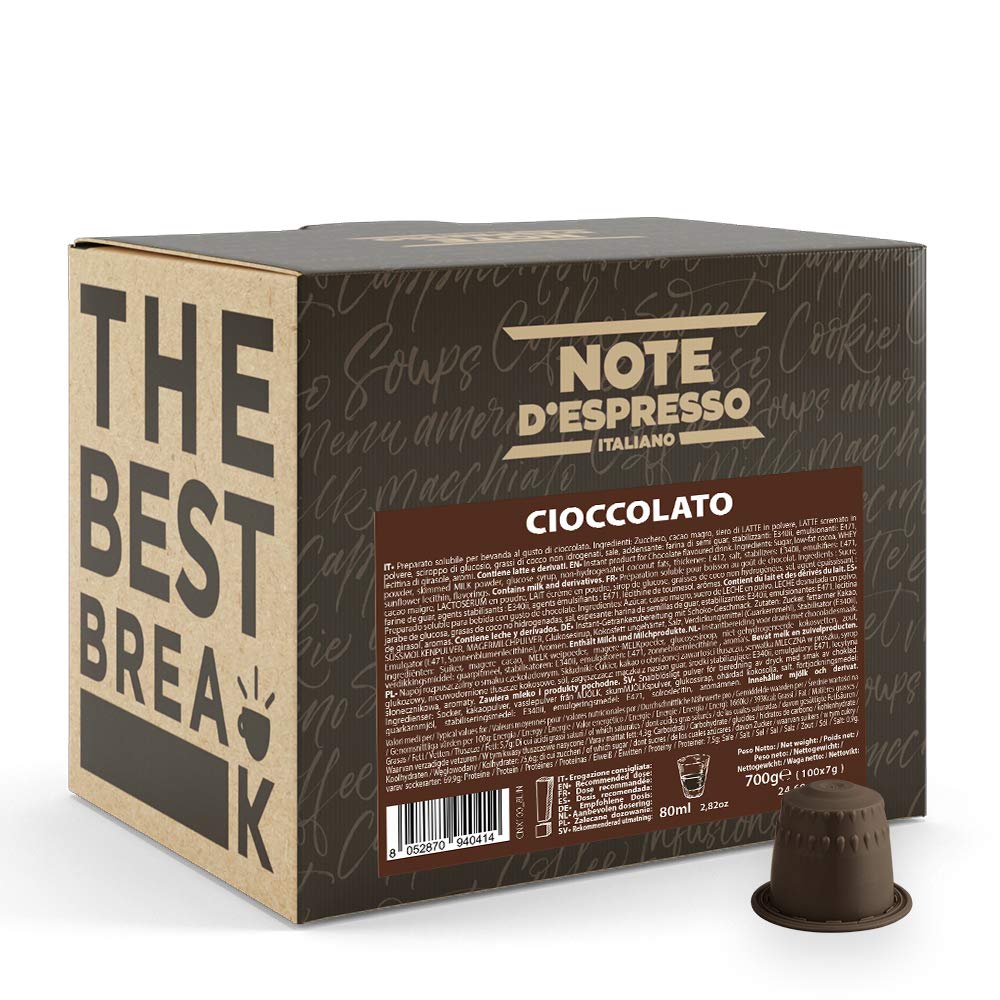 CHOCOLATE instant drink Nespresso Compatible capsules 100x7g. Not a trademark of Neronobile Srl or related companies. INGREDIENTS Sugar, fat-reduced cocoa powder, whey powder, skimmed milk powder, glucose syrup, non-hydrogenated coconut fat, salt, thickener: guar gum, stabilizer: E340ii, emulsifier: E471, sunflower lecithin, flavorings. Contains milk and milk derivatives. INSTRUCTIONS FOR USE 1. Ensure your Nespresso machine is clean and switched on. 2. Open the Nespresso machine and insert one Chocolate Espresso capsule. 3. Close the machine and ensure it is properly locked. 4. Pour 80 ml of water into a cup. 5. Place the cup under the machine's spout. 6. Press the brewing button on the Nespresso machine. SAFETY WARNING May contain milk (potential allergen) MANUFACTURER'S DETAILS NERONOBILE SRL, VIA DELLA TECNICA 18, 36030, SARCEDO, IT See moreNote d'Espresso - Chocolat - Capsules Exclusivement Compatibles avec Machine NESPRESSO - 100 x 7 gDESCRIPTION DU PRODUIT DESCRIPTION DU PRODUIT CHOCOLATE instant drink Nespresso Compatible capsule 100x7g. Is not a trademark of Neronobile Srl, or companies connected to it. INGRÉDIENTS Sucre, cacao maigre, whey (lactosérum) de LAIT en poudre, LAIT écrémé en poudre, sirop de glucose, graisse de coco non hydrogénée, sel, épaississant : gomme de guar, stabilisant : E340ii, émulsifiant : E471, lécithine de tournesol, arômes. Contient du lait et des dérivés du lait. MODE D'EMPLOI 1. Assurez-vous que votre machine Nespresso est propre et allumée. 2. Ouvrez la machine Nespresso et insérez une capsule Note d'Espresso au chocolat. 3. Fermez la machine et assurez-vous qu'elle est correctement verrouillée. 4. Verser 80 ml d'eau dans une tasse. 5. Placez la tasse sous le bec de la machine. 6. Appuyez sur le bouton de traitement sur la machine Nespresso. AVERTISSEMENT DE SÉCURITÉ Peut contenir du lait (allergène potentiel) COORDONNÉES DU FABRICANT NERONOBILE SRL, VIA DELLA TECNICA 18, 36030, SARCEDO, IT Voir plus