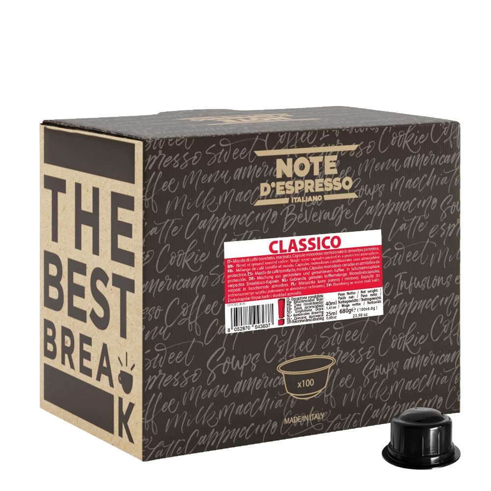 Note d'Espresso Classico coffee capsules are compatible with CAFFITALY machines. The delicious taste and rich aroma of the classic blend in a small 7-gram capsule. Perfect for breakfast or a coffee break. 100 natural, perfect coffee. The classic blend represents the Italian roasting experience. The blend is very well-balanced and offers a good crema, a fruity aroma, and a chocolatey aftertaste in the cup. INGREDIENTS 1 x Note d'Espresso Classico 100 capsules for LAVAZZA and MODO MIO systems SAFETY WARNING Store in a cool, dry place away from direct sunlight. See more