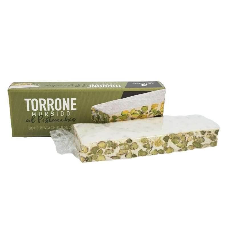 : Soft Pistachio Nougat. Soft pistachio nougat is a traditional Italian treat, particularly prized for its soft texture and intense pistachio flavor. Made with high-quality ingredients, this nougat is perfect for those who appreciate authentic and refined flavors. Product Features: Made with high-quality pistachios. No artificial preservatives or colors. Soft and delicate texture. Intense and enveloping flavor. Convenient packaging, perfect for taking anywhere. Why choose soft pistachio nougat? A true explosion of flavor for the palate. The ideal snack for a sweet and indulgent break. Perfect for sharing with friends and family at parties and special occasions. No artificial ingredients, for a more authentic dessert. A traditional Italian product, a symbol of craftsmanship and quality. Soft pistachio nougat is the ideal choice for those who want to treat themselves to a moment of authentic sweetness. Buy it now and let yourself be seduced by its unique and irresistible taste! Ingredients: Pistachios (35 ), sugar, glucose syrup, Sicilian honey, almonds, egg white, wafer coating 2 (potato decola, water, olive oil), vanillin flavouring.Soft and delicate texture. No preservatives or artificial colors. Made with high-quality pistachios.Description du produit Nougat tendre à la pistacheLe nougat tendre à la pistache est une friandise italienne traditionnelle, particulièrement appréciée pour sa texture moelleuse et son goût intense de pistache. Fabriqué avec des ingrédients de haute qualité, ce nougat est parfait pour ceux qui aiment les saveurs authentiques et raffinées.Caractéristiques du produit:Fabriqué avec des pistaches de haute qualitéSans conservateurs ni colorants artificielsTexture douce et délicateSaveur intense et enveloppanteEmballage pratique et commode à emporter partoutPourquoi choisir le nougat moelleux à la pistache ?Une véritable explosion de goût pour le palaisL'en-cas idéal pour une pause sucrée et gourmandeParfait pour être partagé avec les amis et la famille lors de fêtes et d'occasions spécialesSans ingrédients artificiels, pour un dessert plusù Un produit italien traditionnel, symbole d'artisanat et de qualitéLe nougat mou à la pistache est le choix idéal pour ceux qui veulent s'offrir un moment de douceur authentique. Achetez-le maintenant et laissez-vous séduire par son goût unique et irrésistible ! Ingrédients Pistaches (35 ), sucre, sirop de glucose, miel de Sicile, amandes, blanc d'œuf, enrobage de gaufrette 2 (décola de pomme de terre, eau, huile d'olive), arôme de vanilline.Texture douce et délicate. Sans conservateurs ni colorants artificiels. Fabriqué avec des pistaches de haute qualité.Nougat mou à la pistache