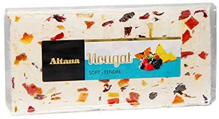 El Artesano Tropical Nougat - Aitana 300g Ingredients: Sugar, glucose-fructose syrup, dehydrated tropical fruits (24 ) (sugar, papaya, blueberries, pineapple, raisins, coconut, banana, coconut fat, citric acid, flavorings, sunflower oil, honey, and preservative E-220), egg white, wafer (potato starch and sunflower oil), and vanilla flavoring. ALLERGENS: May contain traces of peanuts, sesame seeds, and tree nuts (almonds, hazelnuts, walnuts, cashews, pecans, Brazil nuts, pistachios, macadamia nuts, or Australian walnuts). Contains eggs and sulfites. Gluten-free (Gluten 20 ppm) and lactose-free.The main ingredients are: dehydrated tropical fruits, honey, and sugar. Made in Jijona (Alicante). Gluten-free and lactose-free. If you want to surprise your guests this Christmas with something different, this nougat is a great choice, although it can be enjoyed any time of year. The finest selection of tropical fruits has been chosen to create this treat. Its exotic and fresh flavors make every bite an explosion of taste. Aitana Tropical Nougat - El Artesano Nougat, presented in a 300g bar.Nougat tropical El Artesano - Aitana 300 gr Ingrédients : Sucre, sirop de glucose-fructose, fruits tropicaux déshydratés (24 ) (sucre, papaye, myrtilles, ananas, raisins secs, noix de coco, banane, graisse de coco, acide citrique, arômes, huile de tournesol, miel et conservateur E-220), blanc d'œuf, gaufre (fécule de pomme de terre et huile de tournesol) et arôme de vanille. ALLERGENES: Peut contenir des traces d'arachides, de graines de sésame et de noix (amandes, noisettes, noix, noix de cajou, noix de pécan, noix du Brésil, pistaches, noix de macadamia ou noix d'Australie). Contient des œufs et des sulfites. Ne contient pas de gluten (Gluten 20 ppm) et pas de lactose.Les principaux ingrédients sont les suivants : Fruits tropicaux déshydratés, miel, sucre. Fabriqué à Jijona (Alicante). Ne contient pas de gluten ni de lactose. Si vous voulez surprendre ce Noël avec quelque chose de différent sur votre table, ce nougat est un bon choix, bien qu'il puisse être dégusté à tout moment de l'année. La meilleure sélection de fruits tropicaux a été choisie pour l'élaboration de ce bonbon. Ses saveurs exotiques et fraîches font de chaque bouchée une explosion de saveur. Nougat Tropical Aitana - El Artesano Nougat présenté dans une tablette de 300 Gr.Nougat tropical - turron tipo nougat tropical - El Artesano - Aitana 300gr