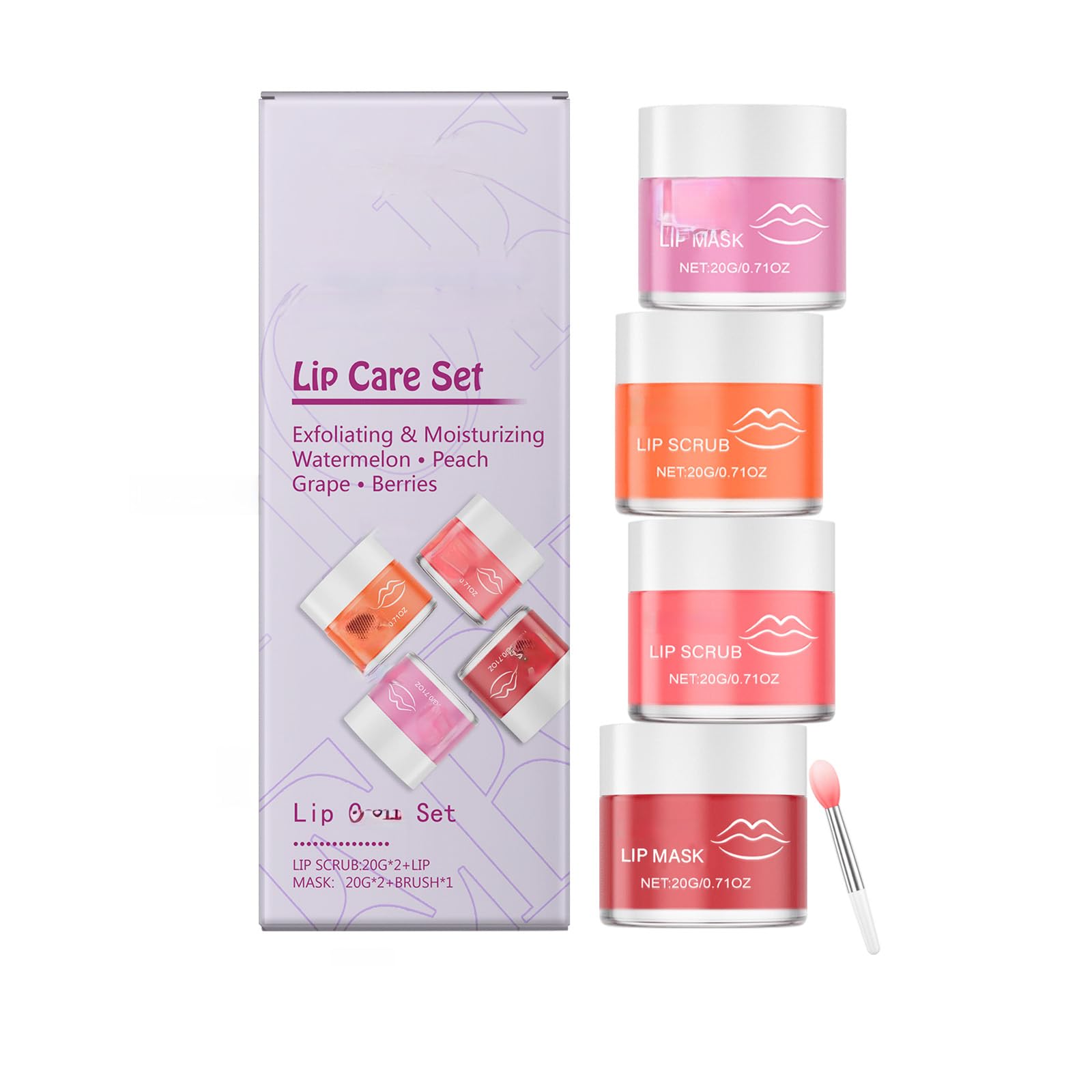 Packaging size: 17.8 4.8cm. Ingredients: Watermelon Lip Scrub: Watermelon Fruit Extract, Glycerin Peach Lip Scrub: Peach Fruit Extract, Sucrose Grape Lip Mask: Beeswax, Grape Fruit Extract Berry Lip Mask: Raspberry Extract, Tocopherol (Vitamin E). Gross weight: 254.9g. Keywords: Nourishing Lips. Product name: Nourishing Lip Care Set. Net Content: 1set.