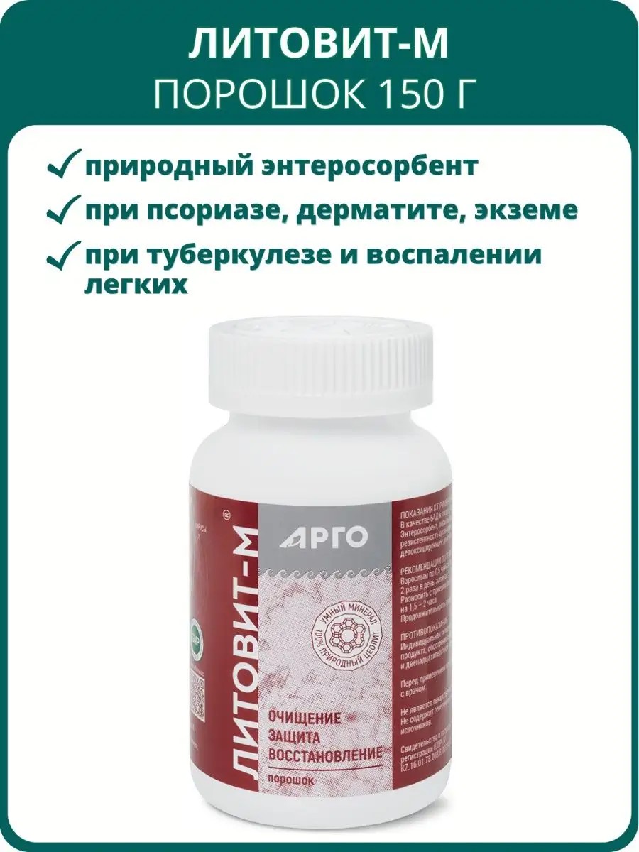 Литовит-М, порошок, 150 г. Уникальный природный энтеросорбент. Применение: при аллергических заболеваниях (крапивница, дерматит, экзема, бронхиальная астма и др.); при псориазе (курсовой прием длительный, 4-6 месяцев, для закрепления эффекта); оказывает общеукрепляющее действие; используется как иммуномодулятор – для улучшения работы защитных сил организма (иммунитета), в т.ч. и для профилактики простудных заболеваний, при гайморите или тонзиллите; при заболеваниях полости рта (применяется в виде полосканий и ванночек); для снятия отравлений (пищевых или алкогольных) – применяется при запоях, а также для профилактики у лиц, имеющих риск получения отравлений в связи с профессией; при заболеваниях дыхательной системы: туберкулезе легких или воспалении легких; в комплексных мероприятиях – для восстановления после переломов (осложненных и неосложненных). Состав: Цеолиты (клиноптилолит, монтмориллонит). Инструкция по применению: По 0,5 чайной ложки порошка (1,25 г) 2 раза в день, за 30–40 минут до еды, запивать 0,5–1 стаканом воды. Прием Литовита-М разносить по времени с приемом лекарственных препаратов и других пищевых добавок на 1,5–2 часа. Длительность приема – 1 месяц.