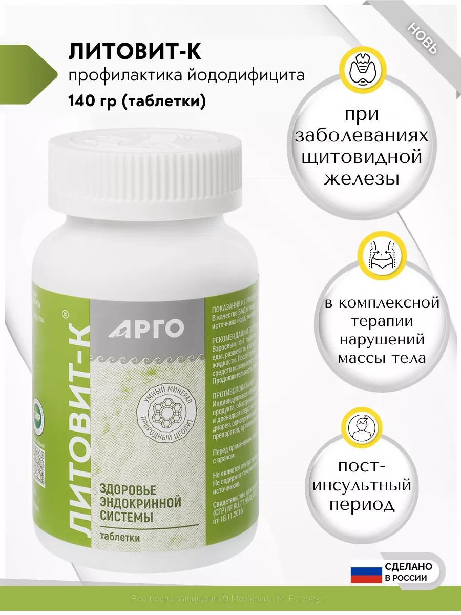 Литовит К это БАД Арго с природным пищевым цеолитом и ламинарией в виде таблеток. Это детокс для похудения и очищения организма. Как энтеросорбент помогает при аллергии. Укрепляет иммунитет и улучшает работу жкт и кишечника. Полезен при астме и псориазе. Улучшает иммунитет и позволяет эффективнее бороться с простудой и гриппом. Благодаря ламинарии является источником витаминов и йода для здоровья щитовидной железы. Полезен для сердца и сосудов при атеросклерозое и высоком холестерине.