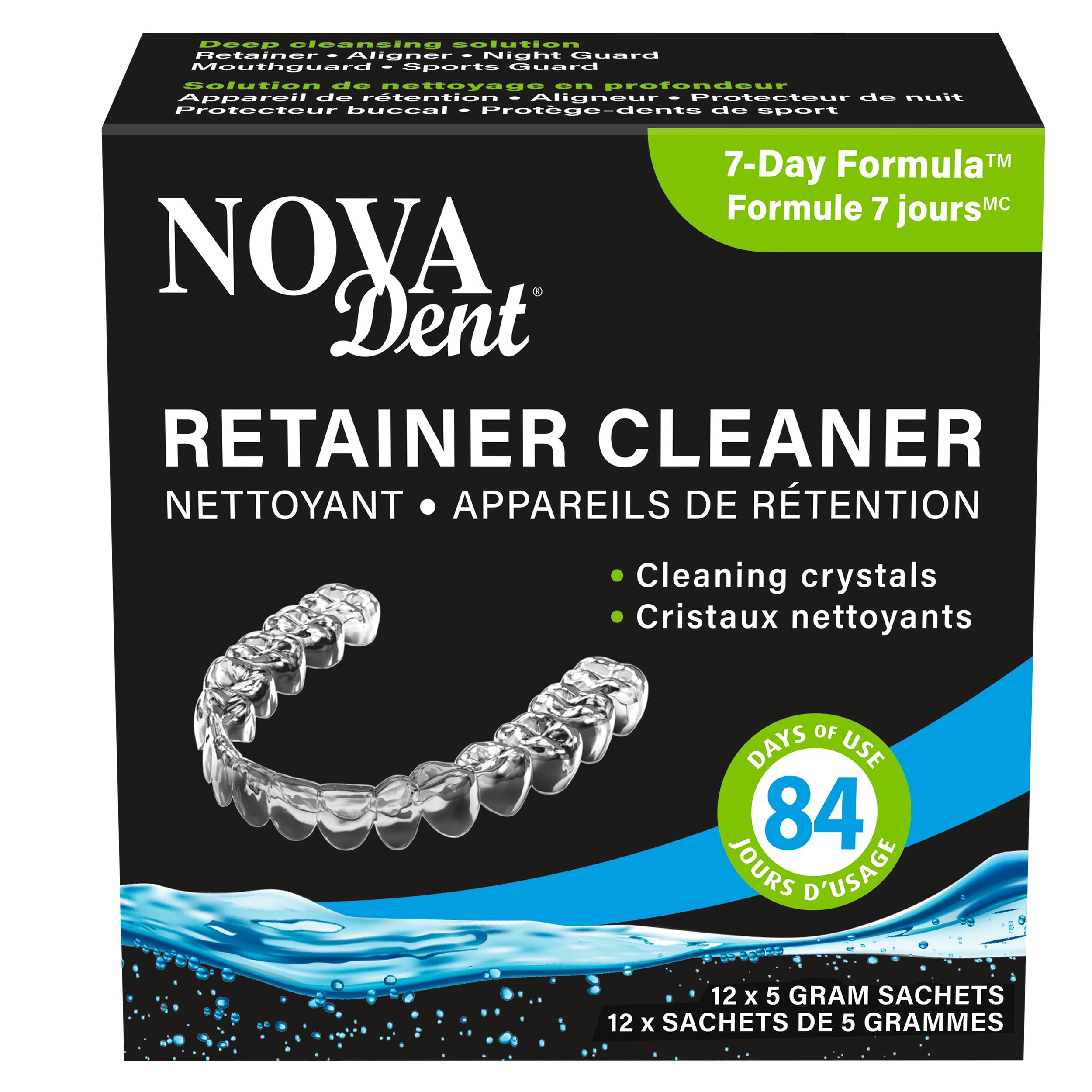 Professional quality: cleansing formula developed by dental health professionals. For external use only. Do not use to clean or whiten teeth. Do not use with soldered or gold-containing appliances.?. Ecological choice: no dyes, no added flavors. Made in Canada with local ingredients. Great alternative to ultrasonic bath, UV sterilization and daily tablets.?. Quick cleaning: a 15-minute soak every day, followed by a 1-minute rinse with lukewarm water, keeps your retainer spotlessly clean and hygienic. Removes stains and discoloration.?. 7-Day Formula: one sachet provides a clear solution that lasts a week. The solution is always active and ready to use, at your convenience. You do not need to prepare the cleaning solution every day.?. Active cleaning crystals: deep-cleaning solution for retainers, aligners, night guards, mouthguards, sports mouthguards.?.